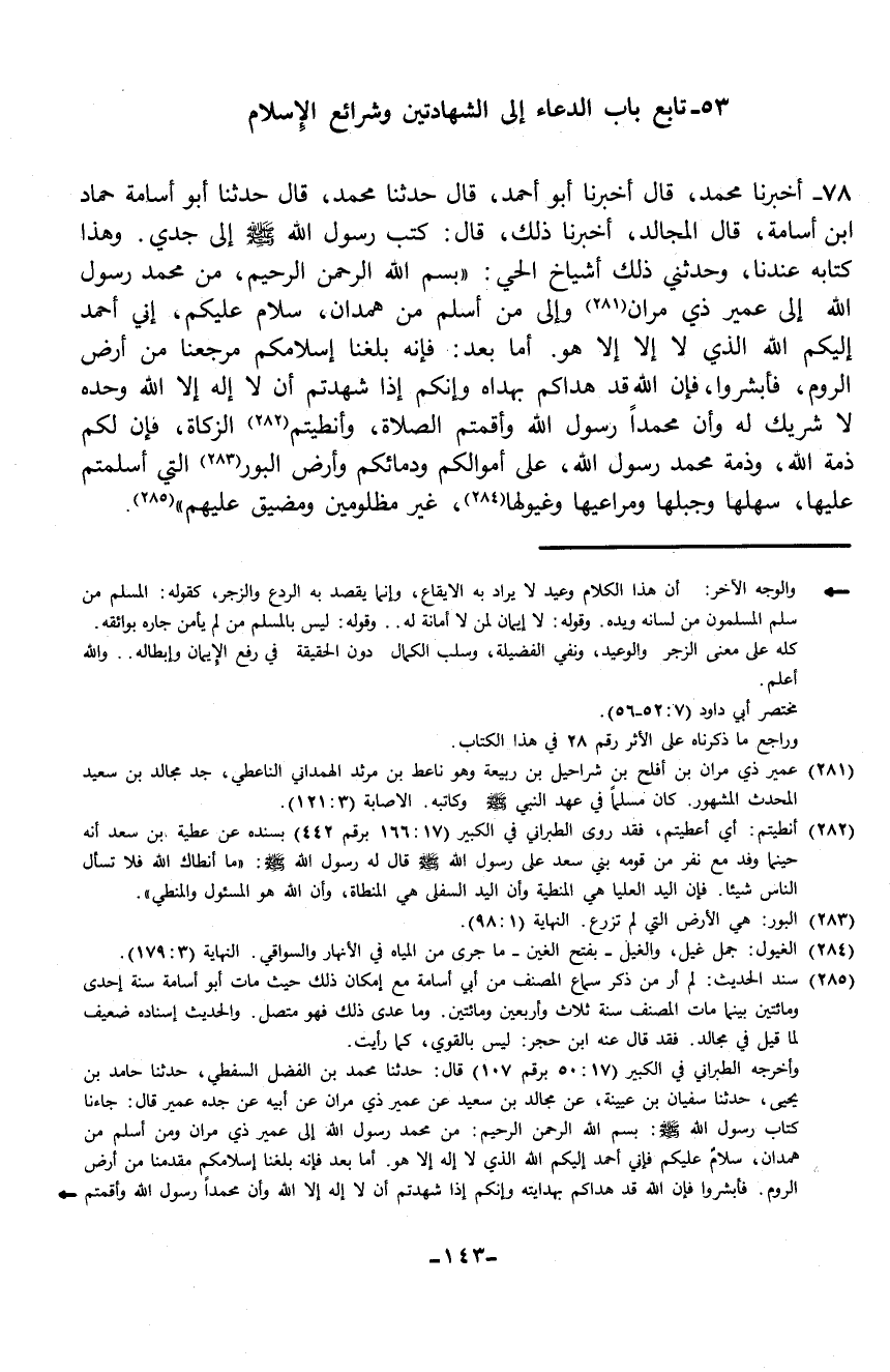 78 - حَدَّثَنَا أَبُو أُسَامَةَ حَمَّادُ بْنُ أُسَامَةَ، قَالَ: الْمُجَالِدُ، أَخْبَرَنَا ذَلِكَ، قَالَ: كَتَبَ رَسُولُ اللَّهِ صَلَّى اللهُ عَلَيْهِ وَسَلَّمَ إِلَى جَدِّي وَهَذَا كِتَابُهُ عِنْدَنَا، وحَدَّثَنِي ذَلِكَ أشْيَاخُ الْحَيِّ، " §بسْمِ اللَّهِ الرَّحْمَنِ الرَّحِيمِ، مِنْ مُحَمَّدٍ رَسُولِ اللَّهِ إِلَى عُمَيْرٍ ذِي مُرَّانَ وَإِلَى مَنْ أَسْلَمَ مِنْ هَمْدَانَ، سَلَامٌ عَلَيْكُمْ، إِنِّي أَحْمَدُ إِلَيْكُمُ اللَّهَ الَّذِي لَا إِلَهَ إِلَّا هُوَ. أَمَّا بَعْدُ: فَإِنَّهُ بَلَغَنَا إسْلَامُكُمْ مَرْجِعَنَا مِنْ أَرْضِ الرُّومِ، فَأَبْشِرُوا فَإِنَّ اللَّهَ قَدْ هَدَاكُمْ بِهُدَاهُ، وَإِنَّكُمْ إِذَا شَهِدْتُمْ أَنْ لَا إِلَهَ إِلَّا اللَّهُ وَحْدَهُ لَا شَرِيكَ لَهُ وَأَنَّ مُحَمَّدًا رَسُولُ اللَّهِ، وَأَقَمْتُمُ الصَّلَاةَ، وَأَنْطَيْتُمُ الزَّكَاةَ، فَإِنَّ لَكُمْ ذِمَّةَ اللَّهِ، وَذِمَّةَ مُحَمَّدٍ رَسُولِ اللَّهِ، عَلَى أمْوالِكُمْ وَدِمَائِكُمْ وَأرْضِ الْبُورِ الَّتِي أسْلَمْتُمْ عَلَيْهَا، سَهْلِهَا وَجَبَلِهَا ومَرَاعِيهَا وَغُيُولِهَا، غَيْرَ مَظْلُومِينَ ومُضَيَّقٍ عَلَيْهِمْ "