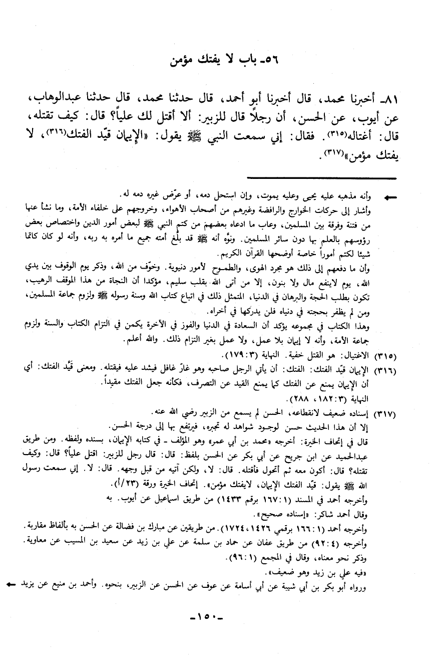 81 - حَدَّثَنَا عَبْدُ الْوَهَّابِ، عَنْ أَيُّوبَ، عَنِ الْحَسَنِ، أَنَّ رَجُلًا قَالَ لِلزُّبَيْرِ أَلَا أَقْتُلُ لَكَ عَلِيًّا قَالَ: كَيْفَ تَقْتُلُهُ؟ قَالَ: أَغْتَالُهُ، فَقَالَ: إِنِّي سَمِعْتُ النَّبِيَّ صَلَّى اللهُ عَلَيْهِ وَسَلَّمَ يَقُولُ: «§الْإِيمَانُ قَيَّدَ الْفَتْكَ لَا يَفْتِكُ مُؤْمِنٌ»