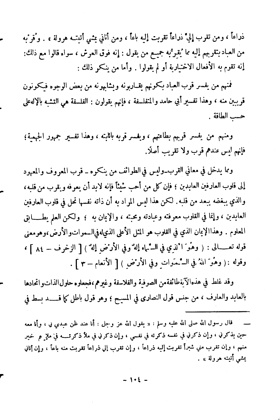 ومما يدخل في معاني القرب ـ وليس في الطوائف من ينكره ـ قرب المعروف والمعبود إلى قلوب العارفين العابدين؛ فإن كل من أحب شيئًا فإنه لابد أن يعرفه ويقرب من قلبه، والذي يبغضه يبعد من قلبه. لكن هذا ليس المراد به أن ذاته نفسها تحل في قلوب العارفين العابدين، وإنما في القلوب معرفته وعبادته ومحبته، والإيمان به؛ ولكن العلم يطابق المعلوم.