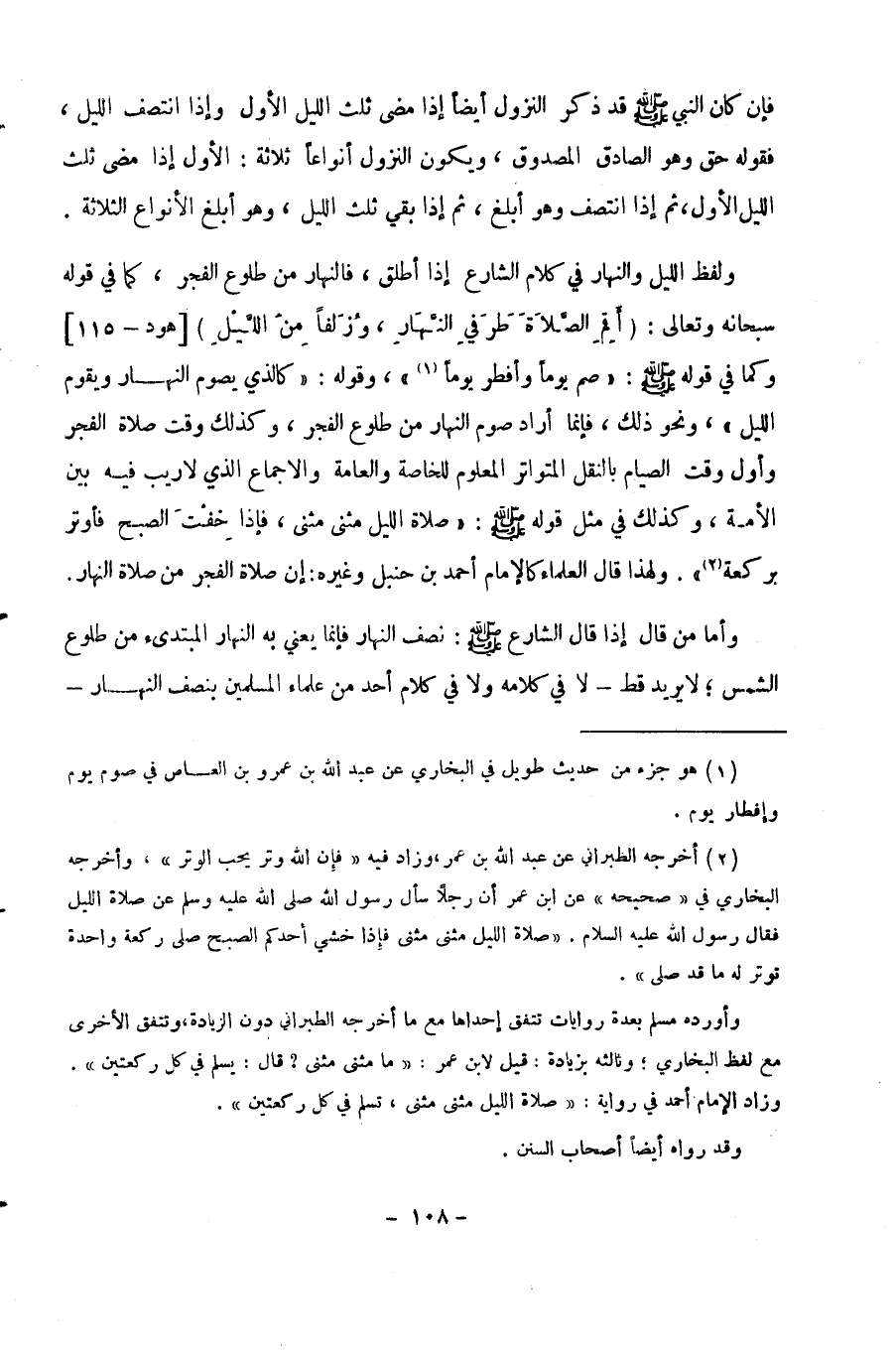 ولفظ " الليل والنهار " في كلام الشارع إذا أطلق، فالنهار من طلوع الفجر، كما في قوله سبحانه وتعالى: {وَأَقِمِ الصَّلاَةَ طَرَفَيِ النَّهَارِ وَزُلَفًا مِّنَ اللَّيْلِ} [هود: 114] ، وكما في قوله صلى الله عليه وسلم: " صم يومًا وأفطر يومًا " وقوله: " كالذي يصوم النهار ويقوم الليل " ونحو ذلك، فإنما أراد صوم النهار من طلوع الفجر، وكذلك وقت صلاة الفجر، وأول وقت الصيام بالنقل المتواتر المعلوم للخاصة والعامة والإجماع الذي لا ريب فيه بين الأمة، وكذلك في مثل قوله صلى الله عليه وسلم: " صلاة الليل مَثْنَى مَثْنَى، فإذا خِفْتَ الصبح فأوتر بركعة ". ولهذا قال العلماء ـ كالإمام أحمد بن حنبل وغيره ـ: إن صلاة الفجر من صلاة النهار.