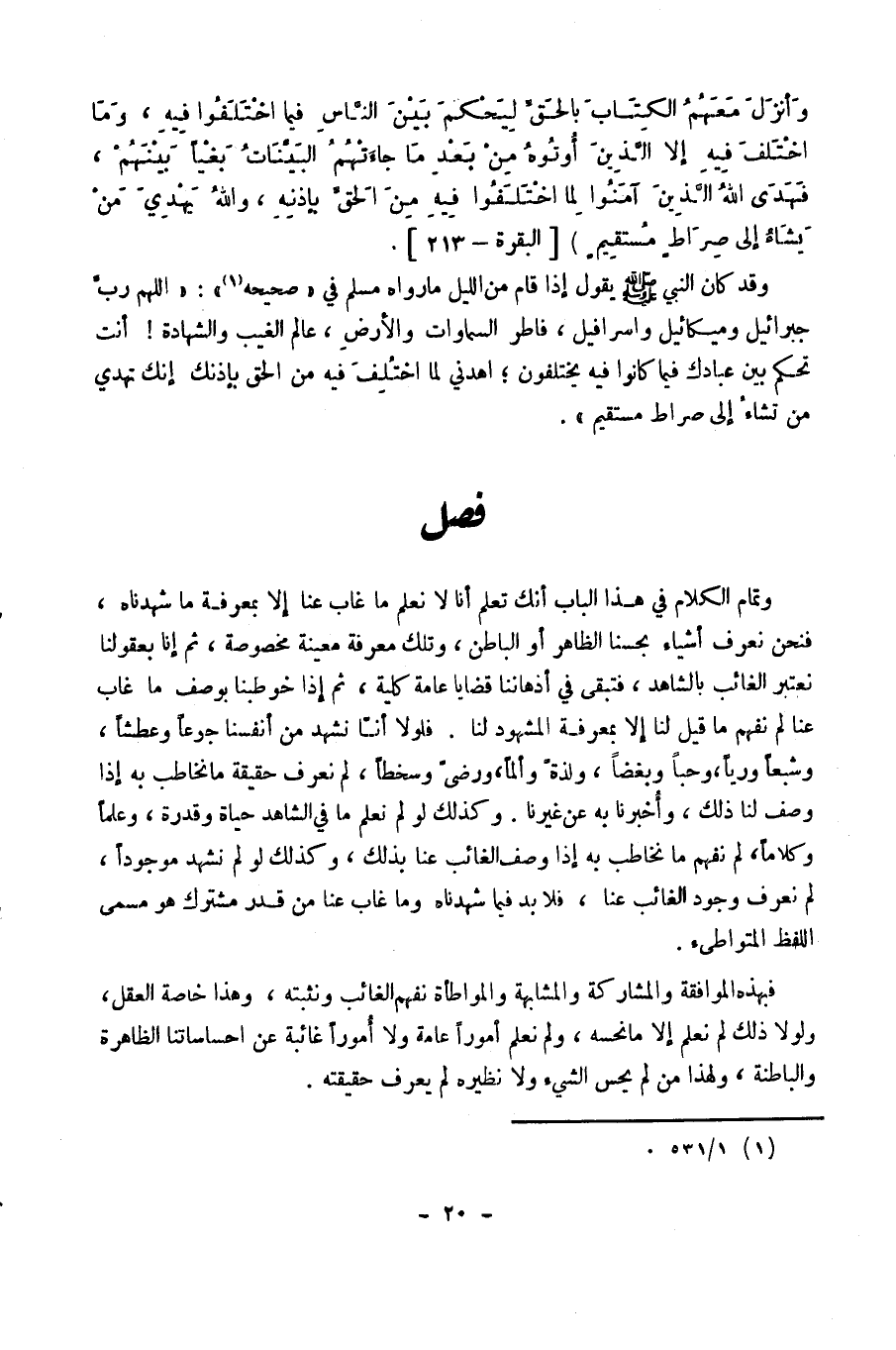 وتمام الكلام في هذا الباب: أنك تعلم أنا لا نعلم ما غاب عنا إلا بمعرفة ما شهدناه، فنحن نعرف أشياء بحسنا الظاهر أو الباطن، وتلك معرفة معينة مخصوصة، ثم إنا بعقولنا نعتبر الغائب بالشاهد، فيبقى في أذهاننا قضايا عامة كلية، ثم إذا خوطبنا بوصف ما غاب عنا لم نفهم ما قيل لنا إلا بمعرفة المشهود لنا.