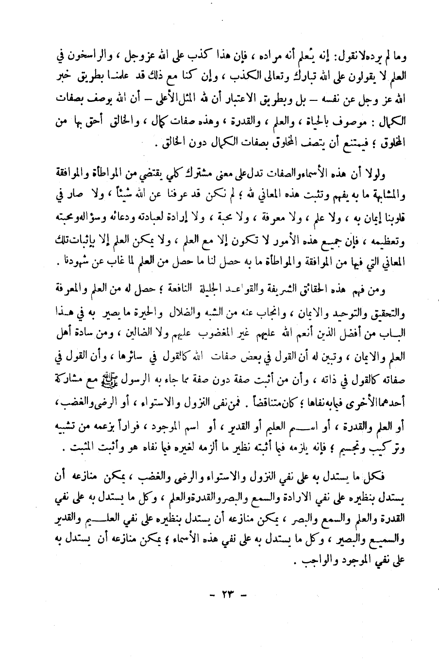 فكل ما يستدل به على نفي النزول والاستواء والرضى والغضب، يمكن منازعه أن يستدل بنظيره على نفي الإرادة، والسمع والبصر، والقدرة والعلم. وكل ما يستدل به على نفي القدرة والعلم والسمع والبصر، يمكن منازعه أن يستدل بنظيره على نفي العلىم والقدير، والسميع والبصير. وكل ما يستدل به على نفي هذه الأسماء، يمكن منازعه أن يستدل به على نفي الموجود والواجب.