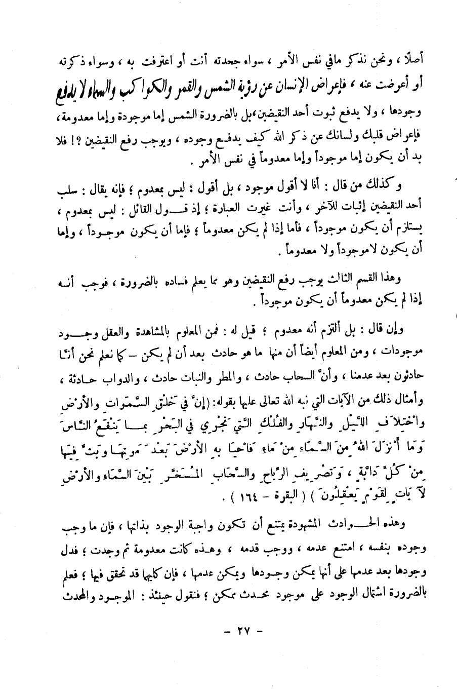 وإن قال: بل التزم أنه معدوم. قيل له: فمن المعلوم بالمشاهدة والعقل وجود موجودات، ومن المعلوم ـ أيضًا ـ أن منها ما هو حادث بعد أن لم يكن، كما نعلم نحن أنا حادثون بعد عدمنا، وأن السحاب حادث، والمطر والنبات حادث، والدواب حادثة، وأمثال ذلك من الآيات التي نبه الله ـ تعالى ـ عليها بقوله: {إِنَّ فِي خَلْقِ السَّمَاوَاتِ وَالأَرْضِ وَاخْتِلاَفِ اللَّيْلِ وَالنَّهَارِ وَالْفُلْكِ الَّتِي تَجْرِي فِي الْبَحْرِ بِمَا يَنفَعُ النَّاسَ وَمَا أَنزَلَ اللهُ مِنَ السَّمَاء مِن مَّاء فَأَحْيَا بِهِ الأرْضَ بَعْدَ مَوْتِهَا وَبَثَّ فِيهَا مِن كُلِّ دَآبَّةٍ وَتَصْرِيفِ الرِّيَاحِ وَالسَّحَابِ الْمُسَخِّرِ بَيْنَ السَّمَاء وَالأَرْضِ لآيَاتٍ لِّقَوْمٍ يَعْقِلُونَ} [البقرة: 146] .