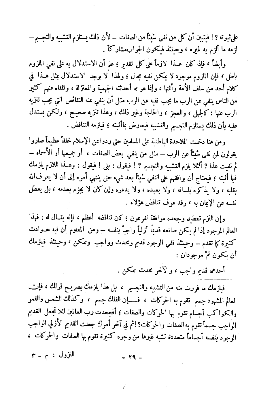 على ثبوته؟ ! فيتبين أن كل من نفي شيئًا من الصفات ـ لأن ذلك يستلزم التشبيه والتجسيم ـ لزمه ما ألزم به غيره. وحينئذ فيكون الجواب مشاركً. وأيضا، فإذا كان هذا لازمًا على كل تقدير، علم أن الاستدلال به على نفي الملزوم باطل؛ فإن الملزوم موجود لا يمكن نفيه بحال؛ ولهذا لا يوجد الاستدلال بمثل هذا في كلام أحد من سلف الأمة وأئمتها، وإنما هو مما أحدثته الجهمية والمعتزلة، وتلقاه عنهم كثير من الناس: ينفي عن الرب ما يجب نفيه عن الرب؛ مثل أن ينفي عنه النقائص التي يجب تنزيه الرب عنها؛ كالجهل، والعجز، والحاجة وغير ذلك. وهذا تنزيه صحيح، ولكن يستدل عليه بأن ذلك يستلزم التجسيم والتشبيه فيعارض بما أثبته؛ فيلزمه التناقض.