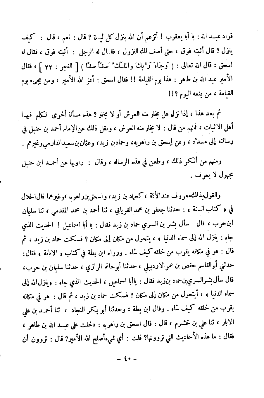 والقول الأول معروف عند الأئمة , كحماد بن زيد، وإسحاق بن راهويه وغيرهما، قال الخلال في [كتاب السنة] : حدثنا جعفر بن محمد الفريابي، ثنا أحمد بن محمد المقدمي، ثنا سليمان بن حرب، قال: سأل بشر بن السُّرِّي حماد بن زيد فقال: يا أبا إسماعيل، الحديث الذي جاء: "ينزل ربنا إلى سماء الدنيا " يتحول من مكان إلى مكان؟ فسكت حماد بن زيد , ثم قال: هو في مكانه يقرب من خلقه كيف شاء. ورواه ابن بطة في كتاب [الإبانة] فقال: حدثني أبو القاسم حفص بن عمر الأردبيلي، حدثنا أبو حاتم الرازي , حدثنا سليمان بن حرب، قال: سأل بشر بن السري حماد بن زيد فقال: يا أبا إسماعيل، الحديث الذي جاء "ينزل الله إلى سماء الدنيا " أيتحول من مكان إلى مكان؟ فسكت حماد بن زيد , ثم قال: هو في مكانه يقرب من خلقه كيف شاء , وقال ابن بطة: وحدثنا أبو بكر النجاد، ثنا أحمد بن على الأبار [هو أبو العباس أحمد بن علي بن مسلم الأبار , الحافظ المتقن، من علماء الأثر ببغداد , وكان من أزهد الناس، وتوفي سنة 092هـ] ، ثنا على بن خَشْرَم [هو أبو بكر أحمد بن محمد بن هانئ الإسكافي الأثرم، أحد الأعلام ومصنف السنن، له مصنفات في علل الحديث، وثقه ابن حبان، وتكلم فيه غيره، مات سنة 273هـ وقيل غير ذلك] .، قال: قال إسحاق بن راهويه: دخلت على عبد الله بن طاهر، فقال: ما هذه الأحاديث التي تروونها؟ قلت: أي شيء، أصلح الله الأمير؟ قال: تروون أن