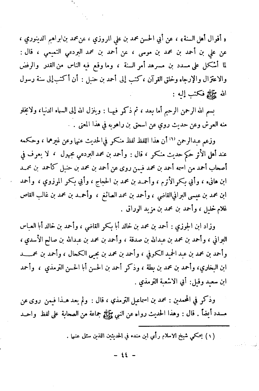 وزعم عبد الرحمن أن هذا اللفظ لفظ منكر في الحديث عنهما وعن غيرهما، وحكمه عند أهل الأثر حكم حديث منكر، وقال: أحمد بن محمد البَرْدَعِيّ مجهول، لا يعرف في أصحاب أحمدمن اسمه [أحمد بن محمد] , فيمن روى عن أحمد بن محمد بن حنبل كأحمد بن محمد بن هانئ، وأبي بكر الأثرم، وأحمد بن محمد بن الحجاج [هو أحمد بن محمد بن الحجاج، عالم بالفقه والحديث، وكان أجل أصحاب الإمام أحمد , وروى عنه مسائل كثيرة، ووصف بأنه كثير التصانيف، توفي سنة 275هـ] ، وأبي بكر المروزي [هو إمام محدث، ورحَّال صادق، من الثقات ببلخ، طوف وسمع الكثير، وخرج لنفسه معجمًا، توفي سنة 376هـ] ، وأحمد بن محمد بن عيسى البراني القاضي، وأحمد بن محمد الصائغ , وأحمد بن محمد بن غالب القاص غلام خليل، وأحمد بن محمد بن مزيد الوراق.