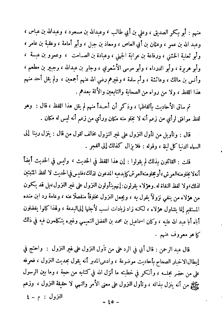 قال عبد الرحمن: قال أبي في الرد على من تأول النزول على غير النزول، واحتج في إبطال الأخبار الصحاح بأحاديث موضوعة: وادعى المدبر أنه يقول بحديث النزول فحرفه على من حضر مجلسه، وأنكر في خطبته ما أنزل الله في كتابه من حجته، وما بين الرسول صلى الله عليه وسلم من أنه ينزل بذاته، وتأول النزول على معنى الأمر والنهي، لا حقيقة النزول، وزعم