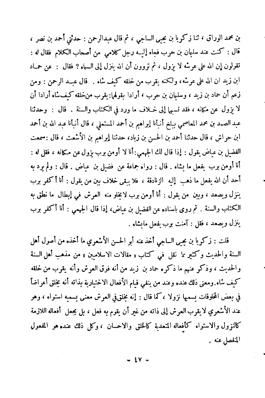 قلت: زكريا بن يحيى الساجي أخذ عنه أبو الحسن الأشعري ما أخذه من أصول أهل السنة والحديث، وكثير مما نقل في كتاب [مقالات الإسلاميين] من مذهب أهل السنة والحديث، وذكر عنهم ما ذكره حماد بن زيد من أنه فوق العرش، وأنه يقرب من خلقه كيف شاء.