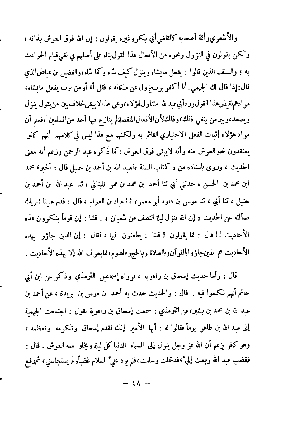 قال: وأما حديث إسحاق بن راهويه , فرواه إسماعيل الترمذي وذكر عن ابن أبي حاتم أنهم تكلموا فيه. قال: والحديث حدث به أحمد بن موسى بن بُرَيْدة , عن أحمد ابن عبد الله بن محمد بن بشير، عن الترمذي: سمعت إسحاق بن راهويه يقول: اجتمعت الجهمية إلى عبد الله بن طاهر يومًا فقالوا له: أيها الأمير , إنك تقدم إسحاق وتكرمه وتعظمه، وهو كافر يزعم أن الله ـ عز وجل ـ ينزل إلى السماء الدنيا كل ليلة ويخلو منه العرش. قال: فغضب عبد الله وبعث إلى , فدخلت عليه وسلمت، فلم يرد على السلام غضبًا ولم يستجلسني، ثم رفع