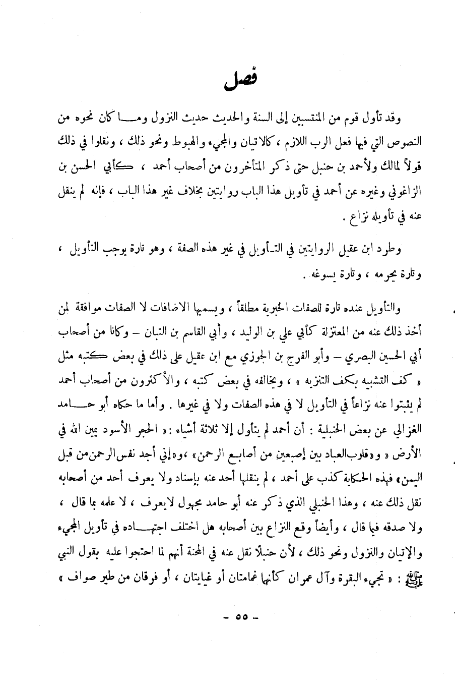 وقد تأول قوم ـ من المنتسبين إلى السنة والحديث ـ حديث النزول ـ وما كان نحوه من النصوص التي فيها فعل الرب اللازم؛ كالإتيان والمجيء , والهبوط ونحو ذلك , ونقلوا في ذلك قولا لمالك، ولأحمد بن حنبل حتى ذكر المتأخرون من أصحاب أحمد ـ كأبي الحسن بن الزاغوني وغيره ـ عن أحمد في تأويل هذا الباب روايتين، بخلاف غير هذا الباب , فإنه لم ينقل عنه في تأويله نزاعًا.