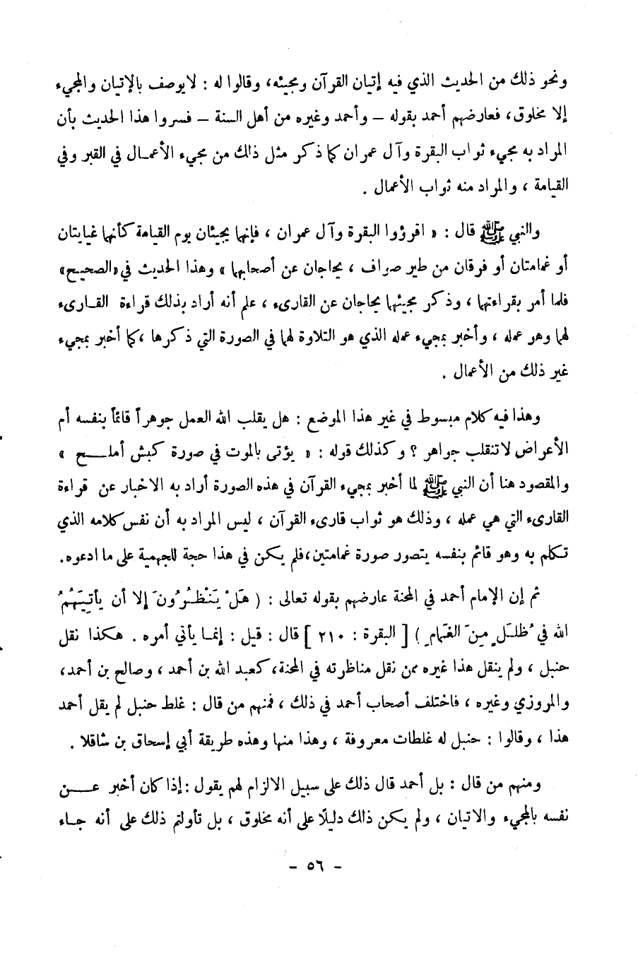 ونحو ذلك من الحديث الذي فيه إتيان القرآن ومجيئه. وقالوا له: لا يوصف بالإتيان والمجيء إلا مخلوق؛ فعارضهم أحمد بقوله: وأحمد وغيره من أئمة السنة ـ فسروا هذا الحديث بأن المراد به مجيء ثواب البقرة وآل عمران، كما ذكر مثل ذلك من مجيء الأعمال في القبر وفي القيامة , والمراد منه ثواب الأعمال.