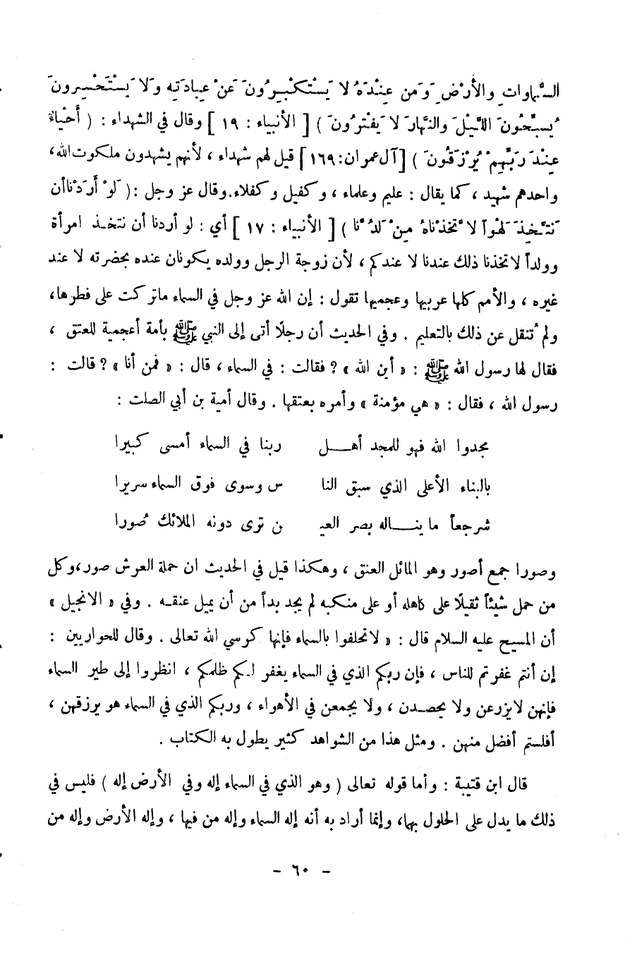 وفي الحديث: أن رجلًا أتى إلى النبي صلى الله عليه وسلم بأمَةٍ أعجمية للعتق، فقال لها رسول الله صلى الله عليه وسلم: " أين اللَّه؟ " قالت: في السماء. قال: " من أنا؟ " قالت: أنت رسول الله، فقال:" هي مؤمنة " وأمره بعتقها. وقال أمية بن أبي الصَّلْت: