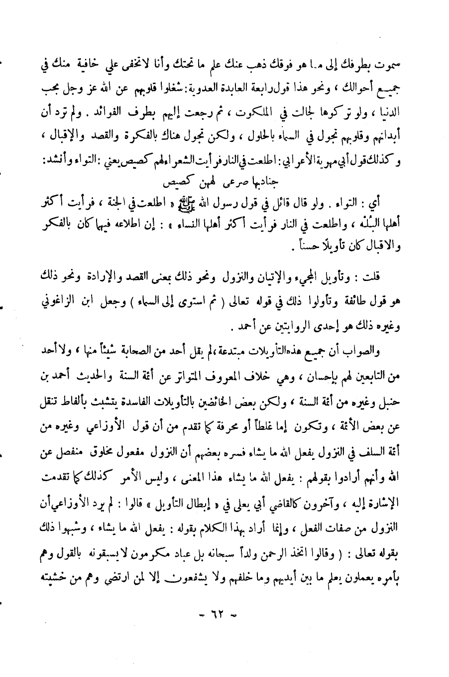 ولكن بعض الخائضين بالتأويلات الفاسدة يتشبث بألفاظ تنقل عن بعض الأئمة، وتكون إما غلطًا أو محرفة، كما تقدم من أن قول الأوزاعي وغيره من أئمة السلف في النزول [يفعل الله ما يشاء] فسره بعضهم أن النزول مفعول مخلوق، منفصل عن الله، وأنهم أرادوا بقولهم: [يفعل الله ما يشاء] هذا المعنى وليس الأمر كذلك، كما تقدمت الإشارة إليه.