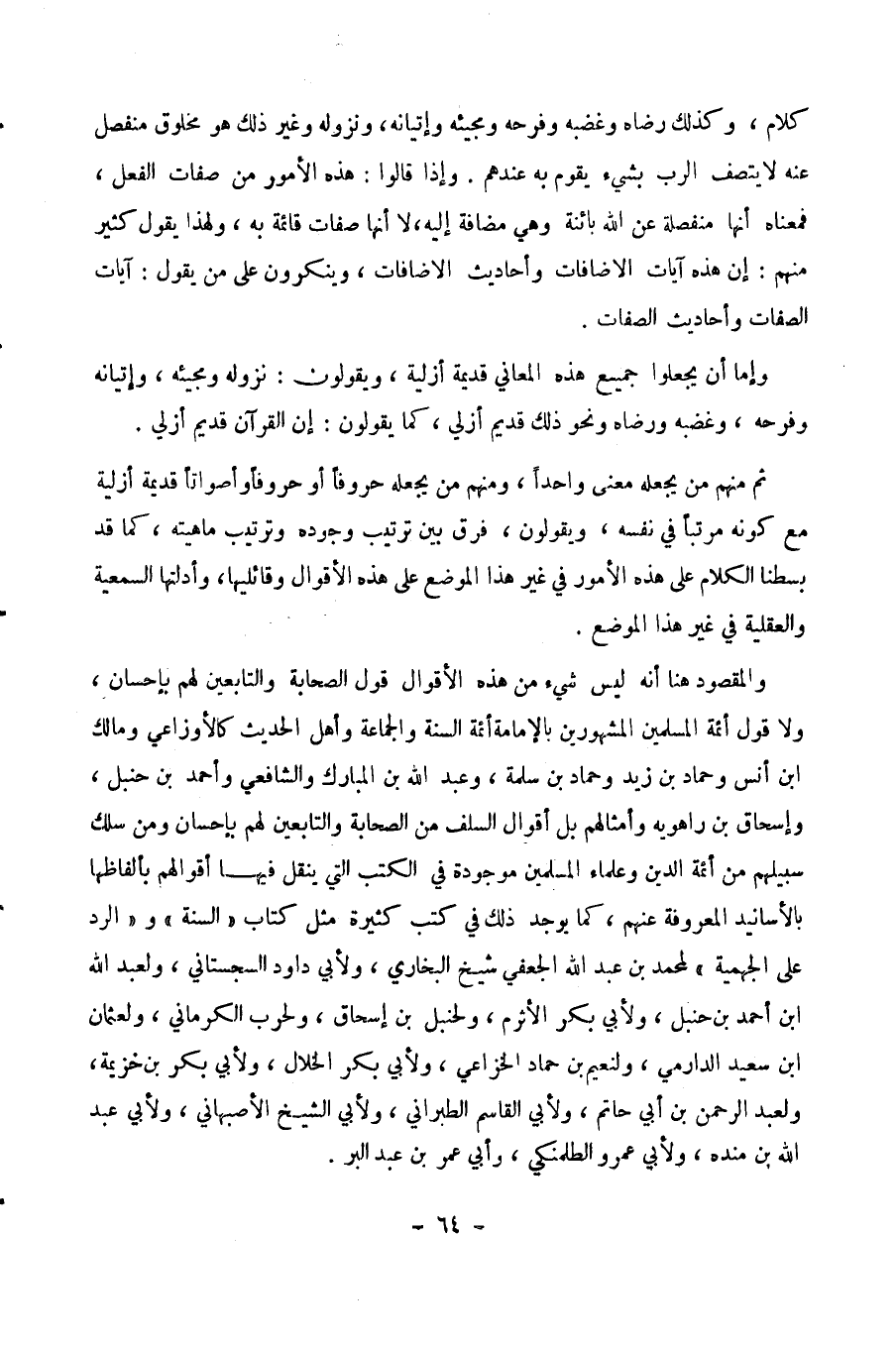 والمقصود هنا: أنه ليس شيء من هذه الأقوال قول الصحابة والتابعين لهم بإحسان ولا قول أئمة المسلمين المشهورين بالإمامة ـ أئمة السنة والجماعة وأهل الحديث ـ كالأوزاعي، ومالك بن أنس، وحماد بن زيد، وحماد بن سلمة، وعبد الله بن المبارك، والشافعي، وأحمد بن حنبل، وإسحاق بن راهويه، وأمثالهم ـ بل أقوال السلف من الصحابة والتابعين لهم بإحسان، ومن سلك سبيلهم من أئمة الدين، وعلماء المسلمين، موجودة في الكتب التي ينقل فيها أقوالهم بألفاظها، بالأسانيد المعروفة عنهم.
