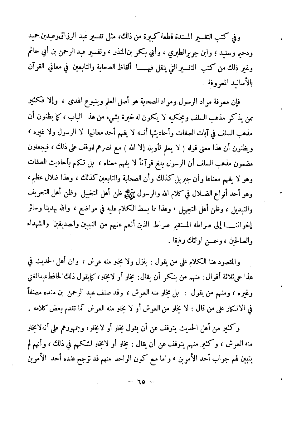 ومنهم من يقول: بل يخلو منه العرش، وقد صنف عبد الرحمن بن منده مصنفًا في الإنكار على من قال: لا يخلو من العرش، أو لا يخلو منه العرش ـ كما تقدم بعض كلامه.