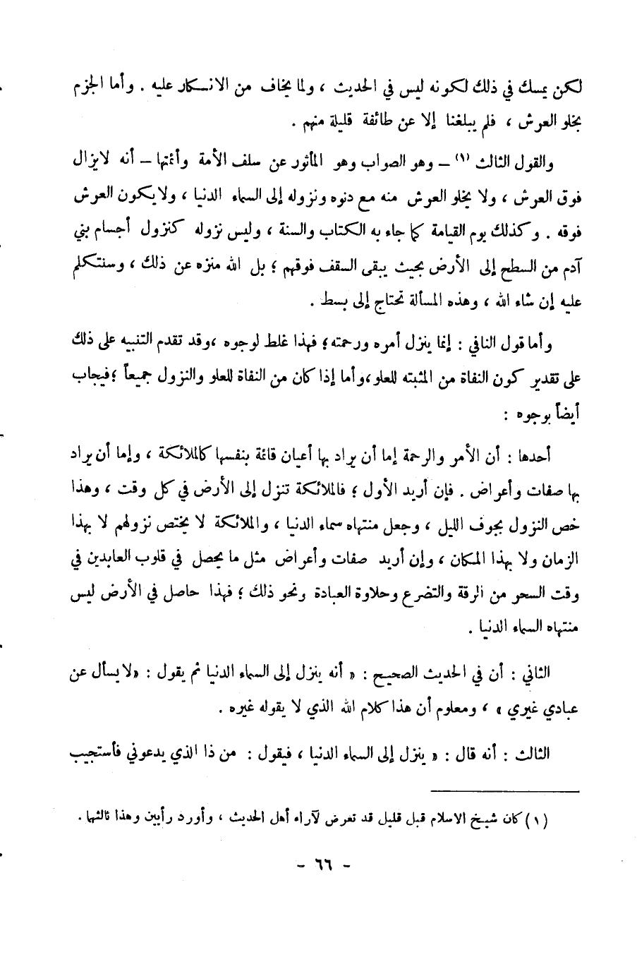 والقول الثالث ـ وهو الصواب وهو المأثور عن سلف الأمة وأئمتها ـ: إنه لا يزال فوق العرش، ولا يخلو العرش منه، مع دنوه ونزوله إلى السماء الدنيا، ولا يكون العرش فوقه. وكذلك يوم القيامة كما جاء به الكتاب والسنة، وليس نزوله كنزول أجسام بني آدم من السطح إلى الأرض، بحيث يبقى السقف فوقهم، بل الله منزه عن ذلك، وسنتكلم عليه إن شاء الله، وهذه المسألة تحتاج إلى بسط.