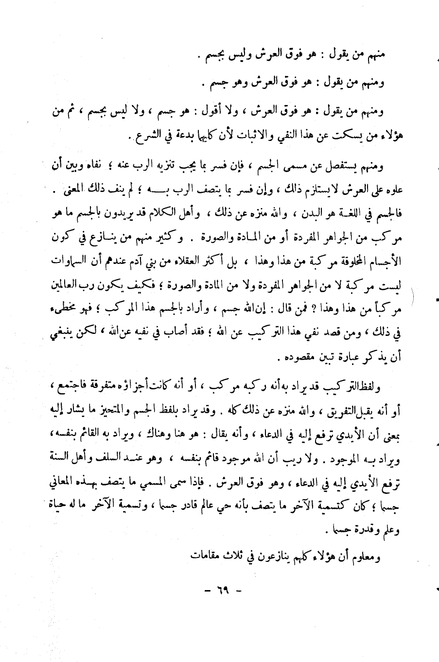 ومنهم من يستفصل عن مسمى الجسم، فإن فسر بما يجب تنزيه الرب عنه نفاه وبين أن علوه على العرش لا يستلزم ذلك، وإن فسر بما يتصف الرب به لم ينف ذلك المعنى. فالجسم في اللغة هو البدن، والله منزّه عن ذلك، وأهل الكلام قد يريدون بالجسم ما هو مركب من الجواهر المفردة أو من المادة والصورة. وكثير منهم ينازع في كون الأجسام المخلوقة مركبة من هذا وهذا، بل أكثر العقلاء من بنى آدم عندهم أن السموات ليست مركبة، لا من الجواهر المفردة، ولا من المادة والصورة، فكيف يكون رب العالمين مركبًا من هذا وهذا؟ فمن قال: إن الله جسم، وأراد بالجسم هذا المركب، فهو مخطئ في ذلك. ومن قصد نفي هذا التركيب عن الله، فقد أصاب في نفيه عن الله، لكن ينبغي أن يذكر عبارة تبين مقصوده.