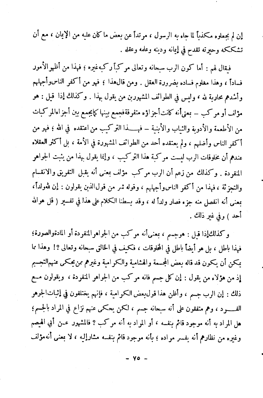 وكذلك من زعم أن الرب مركب مؤلف؛ بمعنى أنه يقبل التفريق والانقسام والتجزئة، فهذا من أكفر الناس وأجهلهم، وقوله شر من قول الذين يقولون: إن لله ولدًا؛ بمعنى أنه انفصل منه جزء فصار ولدًا له، وقد بسطنا الكلام على هذا في تفسير: {قُلْ هُوَ اللَّهُ أَحَدٌ} [الإخلاص: 1] ، وفي غير ذلك. وكذلك إذا قيل: هو جسم؛ بمعنى أنه مركب من الجواهر المنفردة، أو المادة والصورة، فهذا باطل، بل هو ـ أيضًا ـ باطل في المخلوقات، فكيف في الخالق ـ سبحانه وتعالى؟ ! وهذا مما يمكن أن يكون قد قاله بعض المجسمة الهشامية، والكرامية وغيرهم ممن يحكى عنهم التجسيم؛ إذ من هؤلاء من يقول: إن كل جسم فإنه مركب من الجواهر المنفردة، ويقولون مع ذلك: إن الرب جسم، وأظن هذا قول بعض الكرامية، فإنهم يختلفون في إثبات الجوهر الفرد، وهم متفقون على أنه ـ سبحانه ـ جسم.