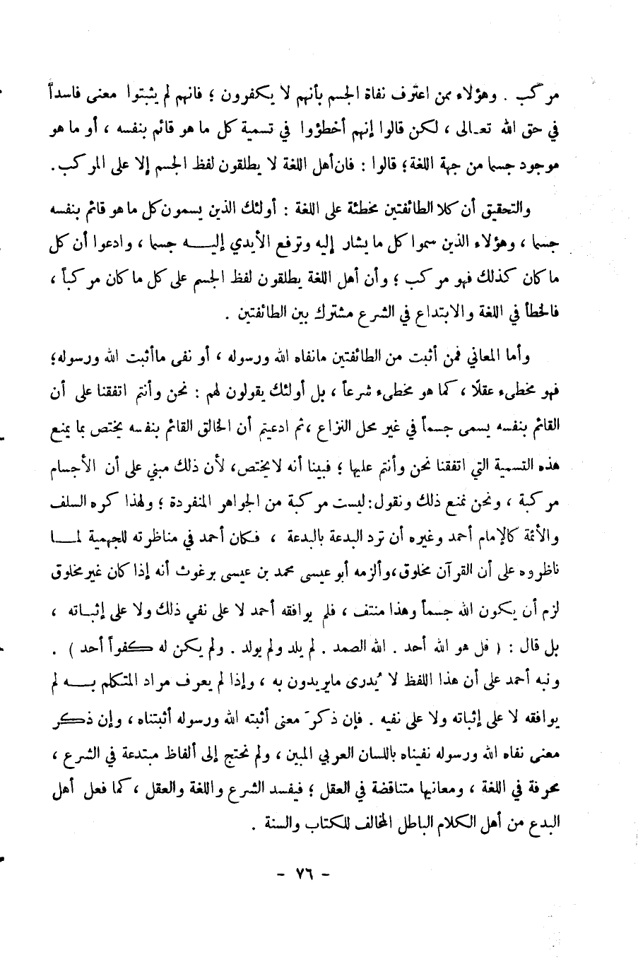 ونبه أحمد على أن هذا اللفظ لا يدرى ما يريدون به. وإذا لم يعرف مراد المتكلم به لم يوافقه، لا على إثباته، ولا على نفيه. فإن ذكر معنى أثبته الله ورسوله أثبتناه، وإن ذكر معنى نفاه الله ورسوله نفيناه باللسان العربي المبين، ولم نحتج إلى ألفاظ مبتدعة في الشرع، محرفة في اللغة، ومعانيها متناقضة في العقل، فيفسد الشرع واللغة والعقل؛ كما فعل أهل البدع من أهل الكلام الباطل المخالف للكتاب والسنة.
