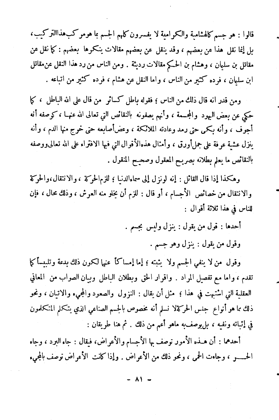 وقول من لا ينفي الجسم ولا يثبته، إما إمساكًا عنهما؛ لكون ذلك بدعة وتلبيسًا كما تقدم، وإما مع تفصيل المراد، وإقرار الحق وبطلان الباطل، وبيان الصواب من المعاني العقلية التي اشتبهت في هذا؛ مثل أن يقال: النزول والصعود والمجيء والإتيان، ونحو ذلك، مما هو أنواع جنس الحركة، لا نسلم أنه مخصوص بالجسم الصناعي الذي يتكلم المتكلمون في إثباته ونفيه، بل يوصف به ما هو أعم من ذلك. ثم هنا طريقان: