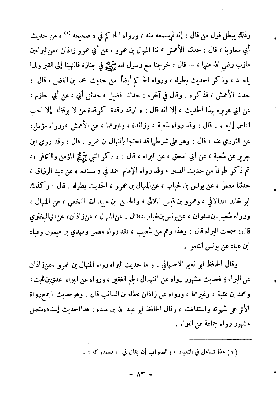 وقال الحافظ أبو نعيم الأصبهاني: وأما حديث البراء رواه المنهال بن عمرو عن زاذان، عن البراء، فحديث مشهور رواه عن المنهال الجَمُّ الغَفِير [الجمّ: الكثير، والغفير: المجتمع، أي العدد الكثير بجملتهم] . ورواه عن البراء عدي بن ثابت، ومحمد بن عقبة، وغيرهما. ورواه عن زاذان عطاء بن السائب. قال: وهو حديث أجمع رواة الأثر على شهرته واستفاضته، وقال الحافظ أبو عبد الله بن منده: هذا الحديث إسناده متصل مشهور، رواه جماعة عن البراء.