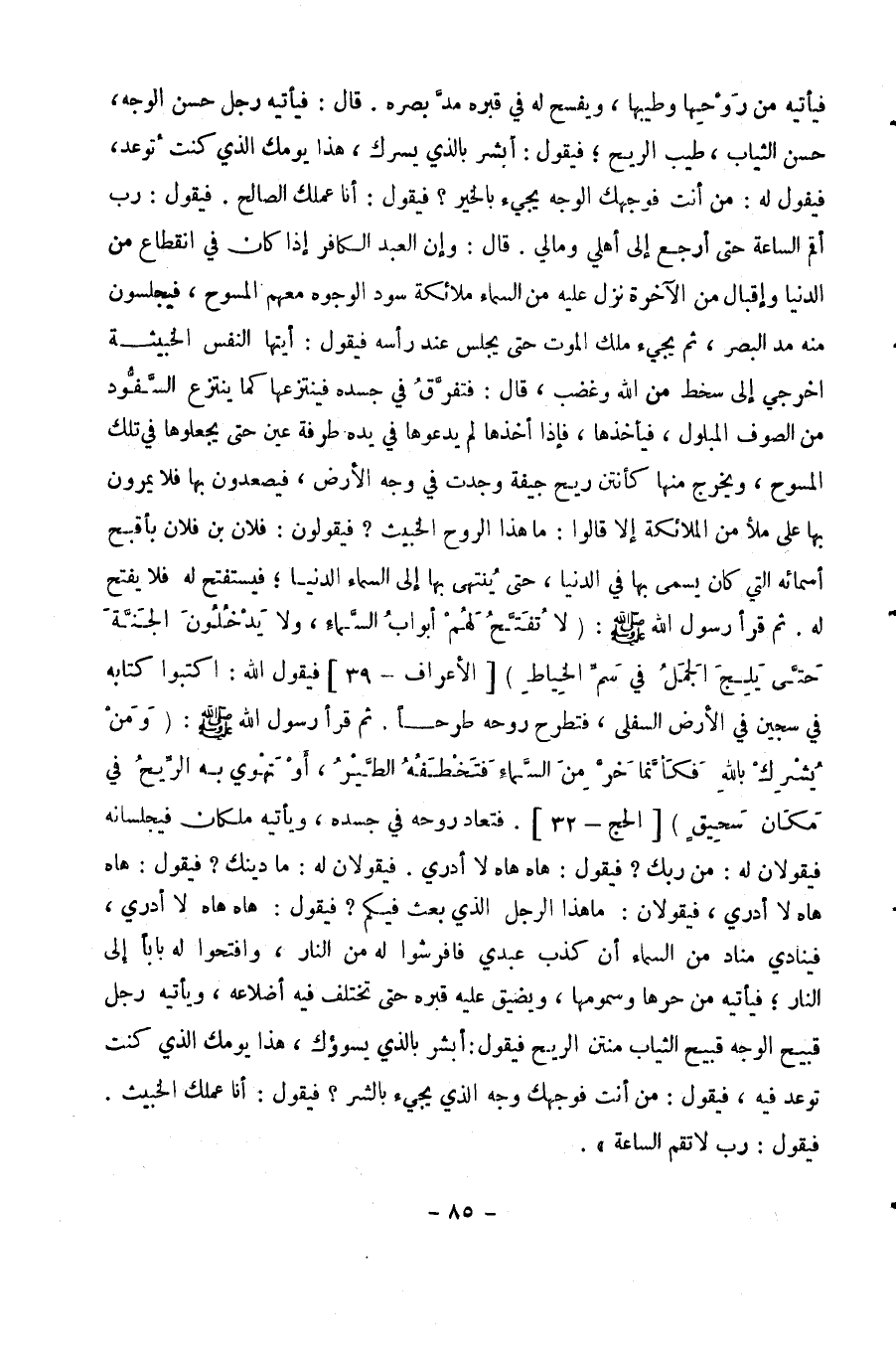 وقال: " وإن العبد الكافر إذا كان في انقطاع من الدنيا وإقبال من الآخرة، نزل عليه من السماء ملائكة سُود الوجوه معهم المسوح، فيجلسون منه مد البصر، ثم يجىء ملك الموت حتى يجلس عند رأسه فيقول: أيتها النفس الخبيثة اخرجى إلى سخط من الله وغضب "، قال: " فتتفرق في جسده، فينزعها كما ينزع السَّفُّود مَن الصوف المبلول، فيأخذها، فإذا أخذها لم يدعوها في يده طرفة عين، حتى يجعلوها في تلك المُسُوح، ويخرج منها كأنتن ريح جِيفَة وُجِدَت على وجه الأرض، فيصعدون بها، فلا يمرون على ملأ من الملائكة إلا قالوا: ما هذه الروح الخبيثة؟ فيقولون: فلان بن فلان بأقبح أسمائه التي كان يسمى بها في الدنيا، حتى ينتهي بها إلى السماء الدنيا، فيستفتح له فلا يفتح له ". ثم قرأ رسول الله صلى الله عليه وسلم: {لاَ تُفَتَّحُ لَهُمْ أَبْوَابُ السَّمَاء وَلاَ يَدْخُلُونَ الْجَنَّةَ حَتَّى يَلِجَ الْجَمَلُ فِي سَمِّ الْخِيَاطِ} [الأعراف: 40] " فيقول الله: اكتبوا كتابه في سجين في الأرض السفلى، فتطرح روحه طرحًا ". ثم قرأ رسول الله صلى الله عليه وسلم: {وَمَن يُشْرِكْ بِاللَّهِ فَكَأَنَّمَا خَرَّ مِنَ السَّمَاء فَتَخْطَفُهُ الطَّيْرُ أَوْ تَهْوِي بِهِ الرِّيحُ فِي مَكَانٍ سَحِيقٍ} [الحج: 31] . " فتعاد روحه في جسده، ويأتيه ملكان فيجلسانه فيقولان له: من ربك؟ فيقول: هاه هاه، لا أدري. فيقولان له: ما دينك؟ فيقول: هاه هاه، لا أدري: فيقولان له: ما هذا الرجل الذي بعث فيكم؟ فيقول: هاه هاه، لا أدري، فينادي مناد من السماء: أن كذب عبدي، فأفرشوه من النار، وألبسوه من النار، وافتحوا له بابًا إلى النار، فيأتيه من حرها وسمُومها، ويضيق عليه قبره حتى تختلف أضلاعه، ويأتيه رجل قبيح الوجه، قبيح الثياب، منتن الريح، فيقول: أبشر بالذي يسوؤك، هذا يومك الذي كنت توعد، فيقول: ومن أنت فوجهك الوجه الذي يجيء بالشر؟ فيقول: أنا عملك الخبيث. فيقول: رب، لا تقم الساعة ".