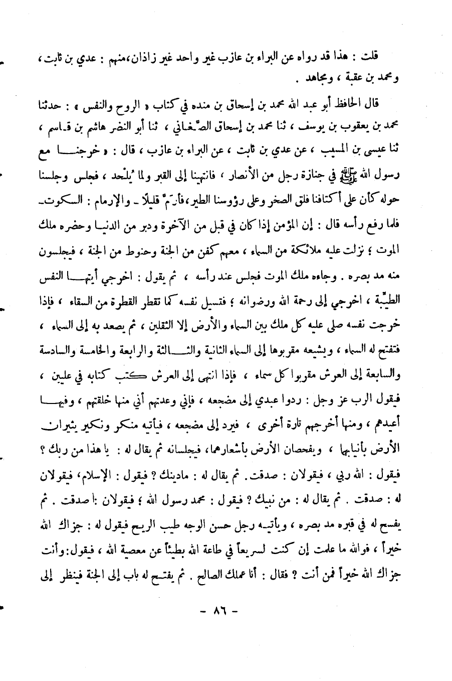 قال الحافظ أبو عبد الله محمد بن إسحاق بن منده في كتاب [الروح والنفس] : حدثنا محمد بن يعقوب بن يوسف، ثنا محمد بن إسحاق الصَّغَاني، ثنا أبو النضر هاشم بن قاسم، ثنا عيسى بن المسيَّب، عن عدي بن ثابت، عن البراء بن عازب، قال: خرجنا مع رسول الله صلى الله عليه وسلم فيجنازة رجل من الأنصار، فانتهينا إلى القبر ولما يلحد، فجلس وجلسنا حوله، كأن على أكتافنا فلق الصخر، وعلى رءوسنا الطير، فأزم قليلا ـ والإزمام: السكوت ـ فلما رفع رأسه قال: " إن المؤمن إذا كان في قُبُل من الآخرة ودُبُر من الدنيا وحضره ملك الموت، نزلت عليه ملائكة من السماء، معهم كفن من الجنة، وحَنُوط من الجنة، فيجلسون منه مدَّ بَصَره، وجاءه ملك الموت فجلس عند رأسه، ثم يقول: اخرجي أيتها النفس الطيبة، اخرجي إلى رحمة الله ورضوانه، فتَسِيل نفسه كما تقطر القَطْرَة من السِّقاء. فإذا خرجت نفسه صلى عليه كل ملك بين السماء والأرض إلا الثقلين، ثم يصعد به إلى السماء فتفتح له السماء ويشيعه مقربوها إلى السماء الثانية والثالثة والرابعة والخامسة والسادسة والسابعة إلى العرش، مقربو كل سماء. فإذا انتهى إلى العرش كتب كتابه في عليين، فيقول الرب عز وجل: ردوا عبدي إلى مضجعه، فإني وعدتهم أني منها خلقتهم، وفيها أعيدهم، ومنها أخرجهم تارة أخرى فيرد إلى مضجعه، فيأتيه مُنْكَر ونَكِير، يثيران الأرض بأنيابهما، ويَفْحَصَان [أي: يحفران] . الأرض بأشعارهما، فيجلسانه ثم يقال له: يا هذا من ربك؟ فيقول: الله ربي، فيقولان: صدقت. ثم يقال له: ما دينك؟ فيقول: الإسلام، فيقولان له: صدقت. ثم يقال له: من نبيك؟ فيقول: محمد رسول الله، فيقولان: صدقت. ثم يفسح له في قبره مد بصره، ويأتيه رجل حسن الوجه، طيب الريح، فيقول له: جزاك الله خيرًا، فوالله ـ ما علمت ـ إن كنت لسريعًا في طاعة الله، بطيئًا عن معصية الله، فيقول: وأنت، جزاك الله خيرًا، فمن أنت؟ فقال: أنا عملك الصالح. ثم يفتح له باب إلى الجنة، فينظر إلى