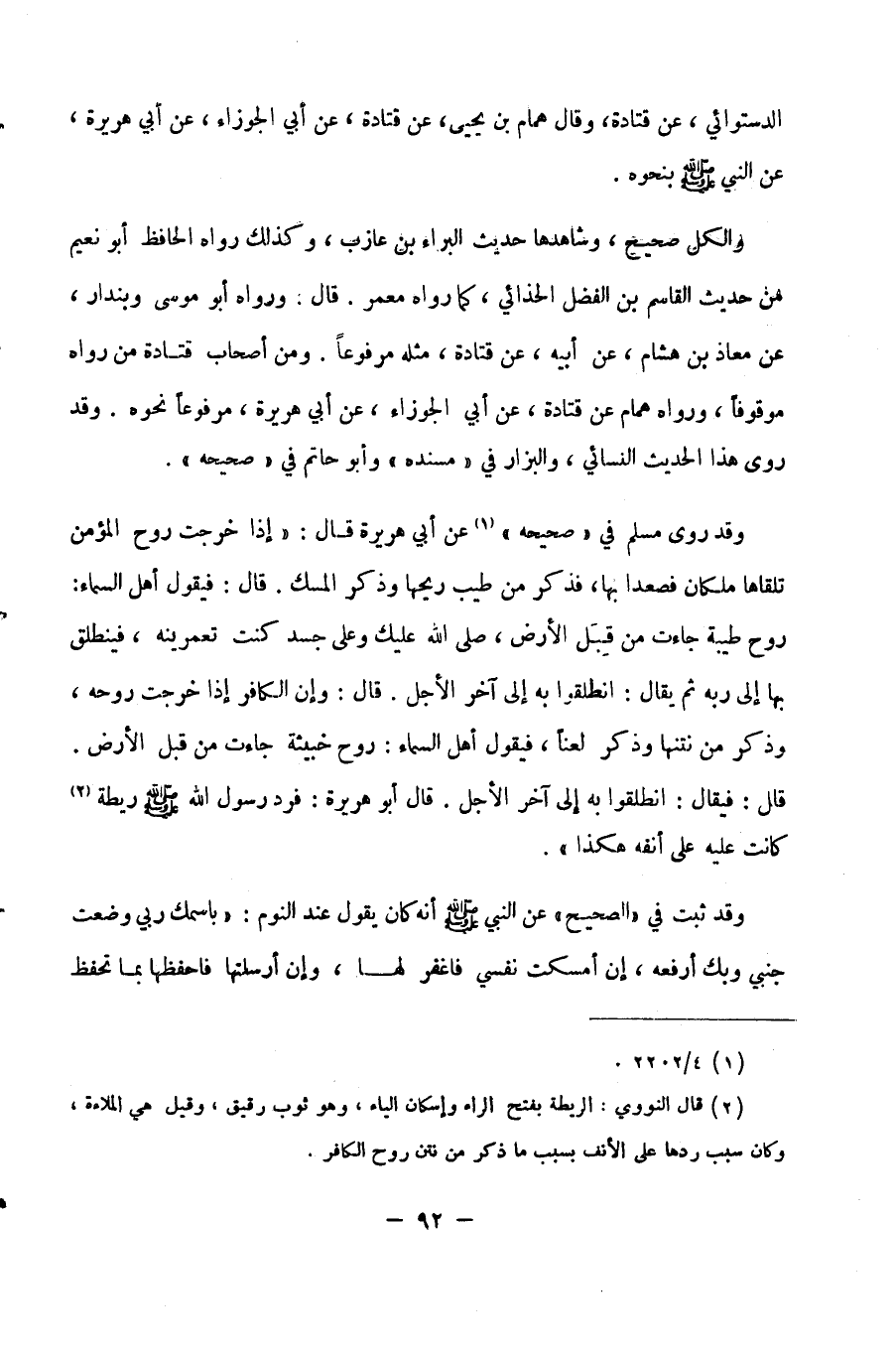 وقد ثبت في الصحيح عن النبي صلى الله عليه وسلم أنه كان يقول عند النوم: " باسمك ربي وضعت جنبي وبك أرفعه، إن أمسكت نفسي فاغفر لها، وإن أرسلتها فاحفظها بما تحفظ به عبادك الصالحين "، وفي الصحيح أيضًا: أنه كان يقول: " اللهم أنت خلقت نفسي، وأنت تتوفاها، لك مماتها ومحياها، فإن أمسكتها فارحمها، وإن أرسلتها فاحفظها بما تحفظ