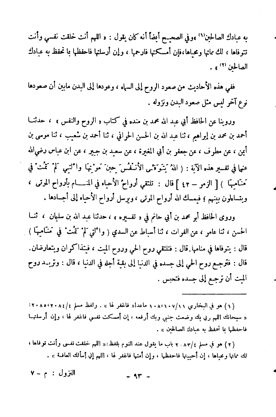 وروينا عن الحافظ أبي عبد الله محمد بن منده في كتاب [الروح والنفس] : حدثنا أحمد بن محمد بن إبراهيم، ثنا عبد الله بن الحسن الحراني، ثنا أحمد بن شعيب، ثنا موسى بن أيمن، عن مطرف، عن جعفر بن أبي المغيرة، عن سعيد بن جبير، عن ابن عباس ـ رضي الله عنهما ـ في تفسير هذه الآية: {اللَّهُ يَتَوَفي الْأَنفُسَ حِينَ مَوْتِهَا وَالَّتِي لَمْ تَمُتْ فِي مَنَامِهَا} [الزمر: 42] . قال: تلتقي أرواح الأحياء في المنام بأرواح الموتى ويتساءلون بينهم، فيمسك الله أرواح الموتى، ويرسل أرواح الأحياء إلى أجسادها.