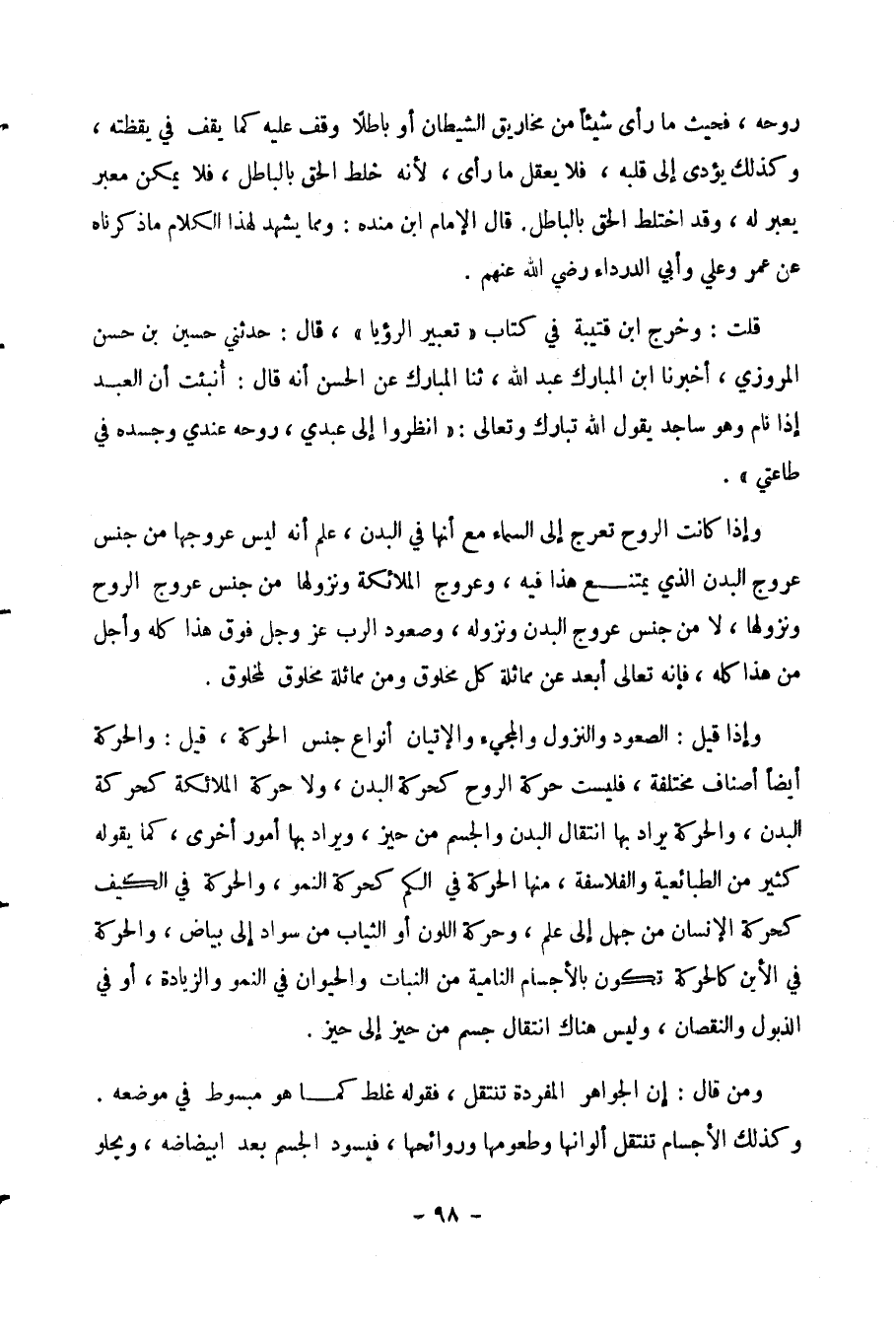 قلت: وخرج ابن قتيبة في كتاب [تعبير الرؤيا] ، قال: حدثني حسين بن حسن المروزي [حسين بن الحسن بن حرب السلمي بن عبد الله المروزي، نزيل مكة. روى عن ابن المبارك ويزيد بن زريع وابن علية وغيرهم، وروى عنه الترمذي وابن ماجه وغيرهما، وثقه ابن حبان وغير واحد. مات سنة 46هـ] ، أخبرنا ابن المبارك عبد الله، ثنا المبارك عن الحسن أنه قال: أنبئت أن العبد إذا نام وهو ساجد يقول الله ـ تبارك وتعالى: " انظروا إلى عبدي، روحه عندي، وجسده في طاعتي ".