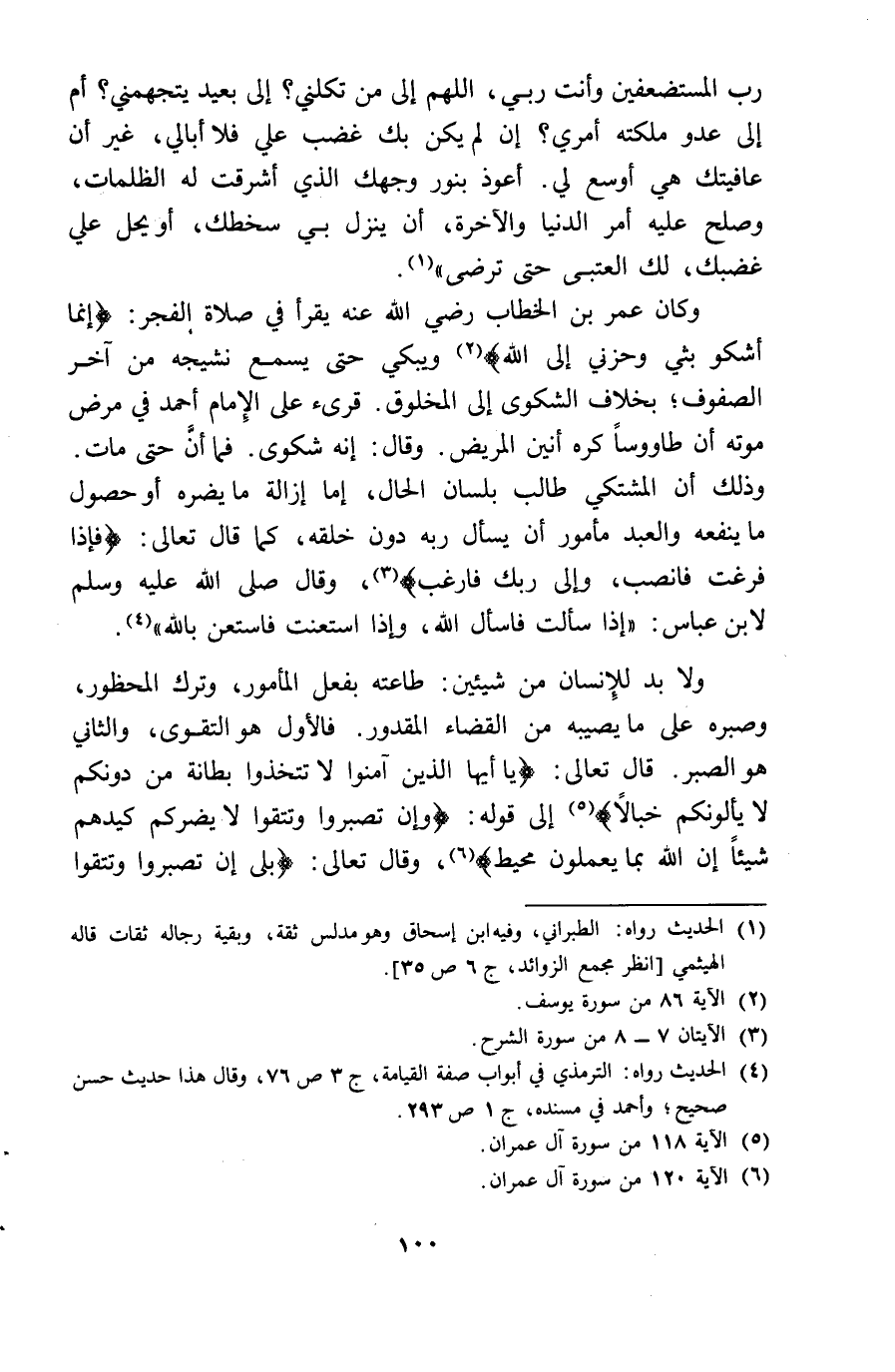 رب الْمُسْتَضْعَفِينَ وَأَنت رَبِّي الله الى من تَكِلنِي الى بعيد يتجهمني أم الى عَدو ملكته أَمْرِي ان لم يكن بك غضب عَليّ فَلَا أُبَالِي غير أَن عافيتك هِيَ أوسع لي أعوذ بِنور وَجهك الَّذِي أشرقت لَهُ الظُّلُمَات وَصلح عَلَيْهِ أَمر الدُّنْيَا وَالْآخِرَة أَن ينزل بِي سخطك أَو يحل عَليّ غضبك لَك العتبى حَتَّى ترْضى وَكَانَ عمر بن الْخطاب رَضِي الله عَنهُ يقْرَأ فِي صَلَاة الْفجْر انما أَشْكُو بثي وحزني الى الله ويبكي حَتَّى يسمع نَشِيجه من آخر الصُّفُوف بِخِلَاف الشكوى الى الْمَخْلُوق قرىء على الامام أَحْمد فِي مرض مَوته أَن طاووسا كره أَنِين الْمَرِيض وَقَالَ انه شكوى فَمَا أَن حَتَّى مَاتَ وَذَلِكَ أَن المشتكي طَالب بِلِسَان الْحَال اما ازالة مَا يضرّهُ أَو حُصُول مَا يَنْفَعهُ وَالْعَبْد مَأْمُور أَن يسْأَل ربه دون خلقه كَمَا قَالَ تَعَالَى فَإِذا فرغت فانصب والى رَبك فارغب وَقَالَ صلى الله عَلَيْهِ وَسلم لِابْنِ عَبَّاس اذا سَأَلت فاسأل الله واذا استغنت فَاسْتَعِنْ بِاللَّه وَلَا بُد للانسان من شَيْئَيْنِ طَاعَته بِفعل الْمَأْمُور وَترك الْمَحْظُور وَصَبره على مَا يُصِيبهُ من الْقَضَاء الْمَقْدُور فَالْأول هُوَ التَّقْوَى وَالثَّانِي هُوَ الصَّبْر قَالَ تَعَالَى يَا أَيهَا الَّذين آمنُوا لَا تَتَّخِذُوا بطانة من دونكم لَا يألونكم خبالا الى قَوْله وان تصبروا وتتقوا لَا يضركم كيدهم شَيْئا ان الله بِمَا يعْملُونَ محيظ وَقَالَ تَعَالَى بلَى ان تصبروا وتتقوا