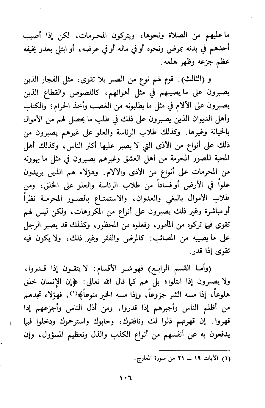 مَا عَلَيْهِم من الصَّلَاة وَنَحْوهَا ويتركون الْمُحرمَات لَكِن اذا أُصِيب أحدهم فِي بدنه بِمَرَض وَنَحْوه أَو فِي مَاله أَو فِي عرضه أَو ابْتُلِيَ بعدو يخيفه عظم جزعه وَظهر هلعه وَالثَّالِث قوم لَهُم نوع من الصَّبْر بِلَا تقوى مثل الْفجار الَّذين يصبرون على مَا يصبيهم فِي مثل أهوائهم كاللصوص والقطاع الَّذين يصبرون على الآلام فِي مثل مَا يطلبونه من الْغَصْب وَأخذ الْحَرَام وَالْكتاب وَأهل الدِّيوَان الَّذين يصبرون على ذَلِك فِي طلب مَا يحصل لَهُم من الْأَمْوَال بالخيانة وَغَيرهَا وَكَذَلِكَ طلاب الرِّئَاسَة والعلو على غَيرهم يصبرون من ذَلِك على أَنْوَاع من الْأَذَى الَّتِي لَا يصبر عَلَيْهَا أَكثر النَّاس وَكَذَلِكَ أهل الْمحبَّة للصور الْمُحرمَة من أهل الْعِشْق وَغَيرهم يصبرون فِي مثل مَا يهوونه من الْمُحرمَات على أَنْوَاع من الْأَذَى والآلام وَهَؤُلَاء هم الَّذين يُرِيدُونَ علوا فِي الأَرْض أَو فَسَادًا من طلاب الرِّئَاسَة والعلو على الْخلق وَمن طلاب الْأَمْوَال بالبغي والعدوان والاستمتاع بالصور الْمُحرمَة نظرا أَو مُبَاشرَة وَغير ذَلِك يصبرون على أَنْوَاع من المكروهات وَلَكِن لَيْسَ لَهُم تقوى فِيمَا تَرَكُوهُ من الْمَأْمُور وفعلوه من الْمَحْظُور وَكَذَلِكَ قد يصبر الرجل على مَا يُصِيبهُ من المصائب كالمرض والفقر وَغير ذَلِك وَلَا يكون فِيهِ تقوى اذا قدر وَأما الْقسم الرَّابِع فَهُوَ شَرّ الْأَقْسَام لَا يَتَّقُونَ اذا قدرُوا وَلَا يصبرون اذا ابتلوا بل هم كَمَا قَالَ الله تَعَالَى ان الانسان خلق هلوعا واذا مَسّه الشَّرّ جزوعا واذا مَسّه الْخَيْر منوعا فَهَؤُلَاءِ تجدهم من أظلم النَّاس وأجبرهم اذا قدرُوا وَمن أذلّ النَّاس وأجزعهم اذا قهروا ان قهرتهم ذلوا لَك ونافقوك وحابوك واسترحموك ودخلوا فِيمَا يدْفَعُونَ بِهِ عَن أنفسهم من أَنْوَاع الْكَذِب والذل وتعظيم المسؤول وان