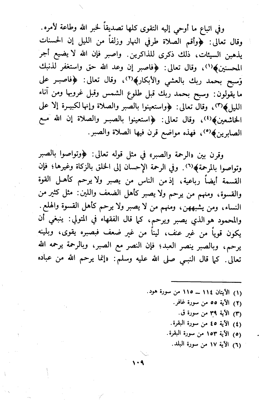 وَفِي اتِّبَاع مَا أُوحِي اليه التَّقْوَى كلهَا تَصْدِيقًا لخَبر الله وَطَاعَة لأَمره وَقَالَ تَعَالَى وأقم الصَّلَاة طرفِي النَّهَار وَزلفًا من اللَّيْل ان الْحَسَنَات يذْهبن السَّيِّئَات ذَلِك ذكرى لِلذَّاكِرِينَ واصبر فَإِن الله لَا يضيع أجر الْمُحْسِنِينَ وَقَالَ تَعَالَى فاصبر ان وعد الله حق واستغفر لذنبك وَسبح بِحَمْد رَبك بالْعَشي والأبكار وَقَالَ تَعَالَى فاصبر على مَا يَقُولُونَ وَسبح بِحَمْد رَبك قبل طُلُوع الشَّمْس وَقبل غُرُوبهَا وَمن آنَاء اللَّيْل وَقَالَ تَعَالَى وَاسْتَعِينُوا بِالصبرِ وَالصَّلَاة وانها لكبيرة الا على الخاشيعن وَقَالَ تَعَالَى اسْتَعِينُوا بِالصبرِ وَالصَّلَاة ان الله مَعَ الصابرين فَهَذِهِ مَوَاضِع قرن فِيهَا الصَّلَاة وَالصَّبْر وَقرن بَين الرَّحْمَة وَالصَّبْر فِي مثل قَوْله تَعَالَى وَتَوَاصَوْا بِالصبرِ وَتَوَاصَوْا بالمرحمة وَفِي الرَّحْمَة الاحسان الى الْخلق بِالزَّكَاةِ وَغَيرهَا فَإِن الْقِسْمَة أَيْضا ربَاعِية اذ من النَّاس من يصبر وَلَا يرحم كَأَهل الْقُوَّة وَالْقَسْوَة وَمِنْهُم من يرحم وَلَا يصبر كَأَهل الضعْف واللين مثل كثير من النِّسَاء وَمن يشبههن وَمِنْهُم من لَا يصبر وَلَا يرحم كَأَهل الْقَسْوَة والهلع والمحمود هُوَ الَّذِي يصبر وَيرْحَم كَمَا قَالَ الْفُقَهَاء فِي الْمُتَوَلِي يَنْبَغِي أَن يكون قَوِيا من غير عنف لينًا من غير ضعف فبصبره يقوى وبلينه يرحم وبالصبر ينصر العَبْد فَإِن النَّصْر مَعَ الصَّبْر وبالرحمة يرحمه الله تَعَالَى كَمَا قَالَ النَّبِي صلى الله عَلَيْهِ وَسلم انما يرحم الله من عباده
