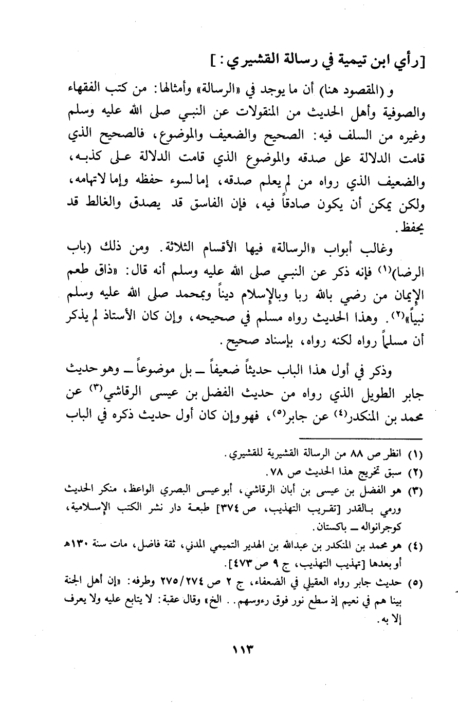 رَأْي ابْن تَيْمِية فِي رِسَالَة الْقشيرِي وَالْمَقْصُود هُنَا أَن مَا يُوجد فِي الرسَالَة وأمثالها من كتب الْفُقَهَاء والصوفية وَأهل الحَدِيث من المنقولات عَن النَّبِي صلى الله عَلَيْهِ وَسلم وَغَيره من السّلف فِيهِ الصَّحِيح والضعيف والموضوع فَالصَّحِيح الَّذِي قَامَت الدّلَالَة على صَدَقَة والموضوع الَّذِي قَامَت الدّلَالَة على كذبة والضعيف الَّذِي رَوَاهُ من لم يعلم صَدَقَة اما لسوء حفظه واما لاتهامه وَلَكِن يُمكن أَن يكون صَادِقا فِيهِ فَإِن الْفَاسِق قد يصدق والغالط قد يحفظ وغالب أَبْوَاب الرسَالَة فِيهَا الْأَقْسَام الثَّلَاثَة وَمن ذَلِك بَاب الرِّضَا فَإِنَّهُ ذكر عَن النَّبِي صلى الله عَلَيْهِ وَسلم أَنه قَالَ ذاق طعم الايمان من رَضِي بِاللَّه رَبًّا وبالاسلام دينا وَبِمُحَمَّدٍ صلى الله عَلَيْهِ وَسلم نَبيا وَهَذَا الحَدِيث رَوَاهُ مُسلم فِي صَحِيحه وان كَانَ الْأُسْتَاذ لم يذكر أَن مُسلما رَوَاهُ لكنه رَوَاهُ باسناد صَحِيح وَذكر فِي أول هَذَا الْبَاب حَدِيثا ضَعِيفا بل مَوْضُوعا وَهُوَ حَدِيث جَابر الطَّوِيل الَّذِي رَوَاهُ من حَدِيث الْفضل بن عِيسَى الرقاشِي عَن مُحَمَّد بن الْمُنْكَدر عَن جَابر فَهُوَ وان كَانَ أول حَدِيث ذكره فِي الْبَاب