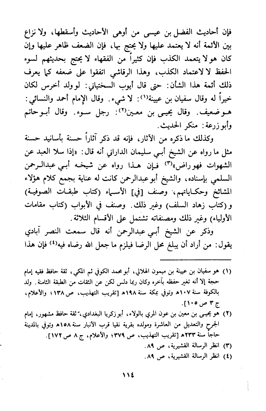 فَإِن أَحَادِيث الْفضل بن عِيسَى من أَوْهَى الْأَحَادِيث وأسقطها وَلَا نزاع بَين الْأَئِمَّة أَنه لَا يعْتَمد عَلَيْهَا وَلَا يحْتَج بهَا فَإِن الضعْف ظَاهر عَلَيْهَا وان كَانَ هُوَ لَا يتَعَمَّد الْكَذِب فَإِن كثيرا من الْفُقَهَاء لَا يحْتَج بِحَدِيثِهِمْ لسوء الْحِفْظ لَا لاعتماد الْكَذِب وَهَذَا الرقاشِي اتَّفقُوا على ضعفه كَمَا يعرف ذَلِك أَئِمَّة هَذَا الشَّأْن حَتَّى قَالَ أَيُّوب السّخْتِيَانِيّ لَو ولد أخرس لَكَانَ خيرا لَهُ وَقَالَ سُفْيَان بن عُيَيْنَة لَا شَيْء وَقَالَ الامام أَحْمد وَالنَّسَائِيّ هُوَ ضَعِيف وَقَالَ يحيى بن معِين رجل سوء وَقَالَ أبوحاتم وَأَبُو زرْعَة مُنكر الحَدِيث وَكَذَلِكَ مَا ذكره من الْآثَار فَإِنَّهُ قد ذكر آثارا حَسَنَة بأسانيد حَسَنَة مثل مَا رَوَاهُ عَن الشَّيْخ أبي سُلَيْمَان الدَّارَانِي أَنه قَالَ اذا سلا العَبْد عَن الشَّهَوَات فَهُوَ رَاض فَإِن هَذَا رَوَاهُ عَن شَيْخه أبي عبد الرَّحْمَن السّلمِيّ باسناده وَالشَّيْخ أَبُو عبد الرَّحْمَن كَانَت لَهُ عناية بِجمع كَلَام هَؤُلَاءِ المشائخ وحكاياتهم وصنف فِي الْأَسْمَاء كتاب طَبَقَات الصُّوفِيَّة وَكتاب زهاد السّلف وَغير ذَلِك وصنف فِي الْأَبْوَاب كتاب مقامات الْأَوْلِيَاء وَغير ذَلِك ومصنفاته تشْتَمل على الْأَقْسَام الثَّلَاثَة وَذكر عَن الشَّيْخ أبي عبد الرَّحْمَن أَنه قَالَ سَمِعت النَّصْر آبادي يَقُول من أَرَادَ أَن يبلغ مَحل الرِّضَا فَيلْزم مَا جعل الله رِضَاهُ فِيهِ فَإِن هَذَا