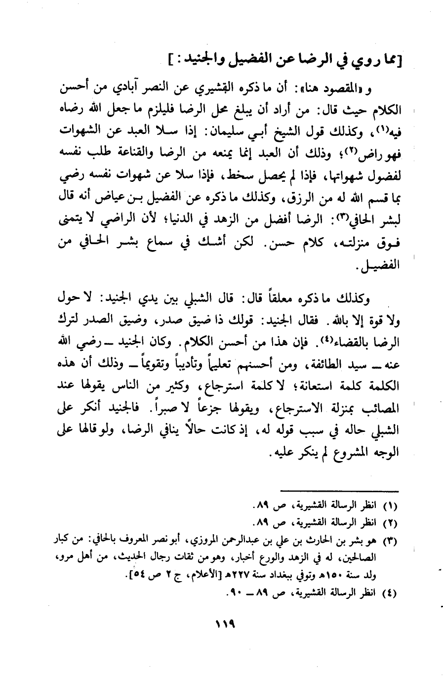 مِمَّا رُوِيَ فِي الرِّضَا عَن الفضيل والجنيد وَالْمَقْصُود هُنَا أَن مَا ذكره الْقشيرِي عَن النَّصْر آبادي من أحسن الْكَلَام حَيْثُ قَالَ من أَرَادَ أَن يبلغ مَحل الرِّضَا فليلزم مَا جعل الله رِضَاهُ فِيهِ وَكَذَلِكَ قَول الشَّيْخ أبي سُلَيْمَان اذا سلا العَبْد عَن الشَّهَوَات فَهُوَ رَاض وَذَلِكَ أَن العَبْد انما يمنعهُ من الرِّضَا والقناعة طلب نَفسه لفضلول شهواتها فاذا لم يحصل سخط فاذا سلا عَن شهوات نَفسه رَضِي بِمَا قسم الله لَهُ من الرزق وَكَذَلِكَ مَا ذكره عَن الفضيل بن عِيَاض أَنه قَالَ لبشر الحافي الرِّضَا أفضل من الزّهْد فِي الدُّنْيَا لِأَن الراضي لَا يتَمَنَّى فَوق مَنْزِلَته كَلَام حسن لَكِن أَشك فِي سَماع بشر الحافي من الفضيل وَكَذَلِكَ مَا ذكره مُعَلّقا قَالَ قَالَ الشبلي بَين يَدي الْجُنَيْد لَا حول وَلَا قُوَّة الا بِاللَّه فَقَالَ الْجُنَيْد قَوْلك ذَا ضيق صدر وضيق الصَّدْر لترك الرِّضَا بِالْقضَاءِ فَإِن هَذَا من أحسن الْكَلَام وَكَانَ الْجُنَيْد رَضِي الله عَنهُ سيد الطَّائِفَة وَمن أحْسنهم تَعْلِيما وتأديبا وتقويما وَذَلِكَ أَن هَذِه الْكَلِمَة كلمة استعانة لَا كلمة استرجاع وَكثير من النَّاس يَقُولهَا عِنْد المصائب بِمَنْزِلَة الاسترجاع ويقولها جزعا لَا صبرا فالجنيد أنكر على الشبلي حَاله فِي سَبَب قَوْله لَهُ اذ كَانَت حَالا يُنَافِي الرِّضَا وَلَو قَالَهَا على الْوَجْه الْمَشْرُوع لم يُنكر عَلَيْهِ