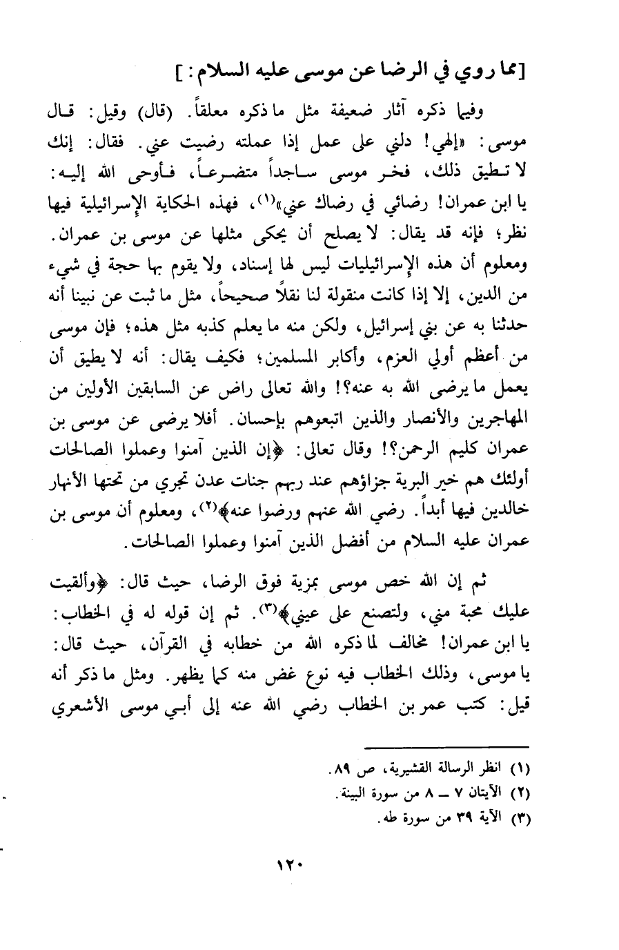 مِمَّا رُوِيَ فِي الرِّضَا عَن مُوسَى عَلَيْهِ السَّلَام وَفِيمَا ذكره آثَار ضَعِيفَة مثل مَا ذكره مُعَلّقا قَالَ وَقيل قَالَ مُوسَى الهي دلَّنِي على عمل اذا عملته رضيت عني فَقَالَ انك لَا تطِيق ذَلِك فَخر مُوسَى سَاجِدا متضرعا فَأوحى الله اليه يَا ابْن عمرَان رضائي فِي رضاك عني فَهَذِهِ الْحِكَايَة الاسرائيلية فِيهَا نظر فَإِنَّهُ قد يُقَال لَا يصلح أَن يحْكى مثلهَا عَن مُوسَى بن عمرَان وَمَعْلُوم أَن هَذِه الاسرائيليات لَيْسَ لَهَا اسناد وَلَا يقوم بهَا حجَّة فِي شَيْء من الدّين الا اذا كَانَت منقولة لنا نقلا صَحِيحا مثل مَا ثَبت عَن نَبينَا أَنه حَدثنَا بِهِ عَن بني اسرائيل وَلَكِن مِنْهُ مَا يعلم كذبه مثل هَذِه فَإِن مُوسَى من أعظم أولي الْعَزْم وأكابر الْمُسلمين فَكيف يُقَال أَنه لَا يُطيق أَن يعْمل مَا يرضى الله بِهِ عَنهُ وَالله تَعَالَى رَاض عَن السَّابِقين الْأَوَّلين من الْمُهَاجِرين وَالْأَنْصَار وَالَّذين اتَّبَعُوهُمْ باحسان أفلايرضى عَن مُوسَى بن عمرَان كليم الرَّحْمَن وَقَالَ تَعَالَى ان الَّذين آمنُوا وَعمِلُوا الصَّالِحَات أُولَئِكَ هم خير الْبَريَّة جزاؤهم عِنْد رَبهم جنَّات عدن تجْرِي من تحتهَا الْأَنْهَار خَالِدين فِيهَا أبدا رَضِي الله عَنْهُم وَرَضوا عَنهُ وَمَعْلُوم أَن مُوسَى بن عمرَان عَلَيْهِ السَّلَام من أفضل الَّذين آمنُوا وَعمِلُوا الصَّالِحَات ثمَّ ان الله خص مُوسَى بمزية فَوق الرِّضَا حَيْثُ قَالَ وألقيت عَلَيْك محبَّة مني ولتصنع عَليّ عَيْني ثمَّ ان قَوْله لَهُ فِي الْخطاب يَا ابْن عمرَان مُخَالف لما ذكره الله من خطابه فِي الْقُرْآن حَيْثُ قَالَ يَا مُوسَى وَذَلِكَ الْخطاب فِيهِ نوع غض مِنْهُ كَمَا يظْهر وَمثل مَا ذكر أَنه قيل كتب عمر بن الْخطاب رَضِي الله عَنهُ الى أبي مُوسَى الْأَشْعَرِيّ