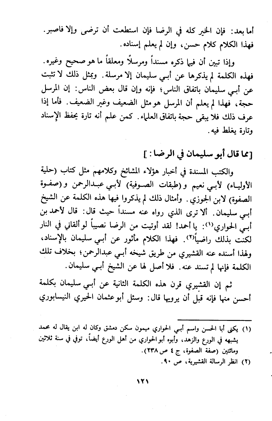 أما بعد فان الْخَيْر كُله فِي الرِّضَا فَإِن اسْتَطَعْت أَن ترْضى والا فاصبر فَهَذَا الْكَلَام كَلَام حسن وان لم يعلم اسناده واذا تبين أَن فِيمَا ذكره مُسْتَندا ومرسلا ومعلقا مَا هُوَ صَحِيح وَغَيره فَهَذِهِ الْكَلِمَة لم يذكرهَا عَن أبي سُلَيْمَان الا مُرْسلَة وبمثل ذَلِك لَا تثبت عَن أبي سُلَيْمَان بِاتِّفَاق النَّاس فَإِنَّهُ وان قَالَ بعض النَّاس ان الْمُرْسل حجَّة فَهَذَا لم يعلم أَن الْمُرْسل هُوَ مثل الضَّعِيف وَغير الضَّعِيف فَأَما اذا عرف ذَلِك فَلَا يبْقى حجَّة بِاتِّفَاق الْعلمَاء كمن علم أَنه تَارَة يحفظ الاسناد وَتارَة يغلط فِيهِ مِمَّا قَالَ أَبُو سُلَيْمَان فِي الرِّضَا والكتب المسندة فِي أَخْبَار هَؤُلَاءِ المشائخ وَكَلَامهم مثل كتاب حلية الْأَوْلِيَاء لأبي نعيم وطبقات الصُّوفِيَّة لأبي عبد الرَّحْمَن صفوة الصفوة لِابْنِ الْجَوْزِيّ وأمثال ذَلِك لم يذكرُوا فِيهَا هَذِه الْكَلِمَة عَن الشَّيْخ أبي سُلَيْمَان أَلا ترى الَّذِي رَوَاهُ عَنهُ مُسْندًا حَيْثُ قَالَ قَالَ لِأَحْمَد بن أبي الْحوَاري يَا أَحْمد لقد أُوتيت من الرِّضَا نَصِيبا لَو ألقاني فِي النَّار لكنه بذلك رَاضِيا فَهَذَا الْكَلَام مأثور عَن أبي سُلَيْمَان بالاسناد وَلِهَذَا أسْندهُ عَنهُ الْقشيرِي من طَرِيق شَيْخه أبي عبد الرَّحْمَن بِخِلَاف تِلْكَ الْكَلِمَة فَإِنَّهَا لم تسند عَنهُ فَلَا أصل لَهَا عَن الشَّيْخ أبي سُلَيْمَان ثمَّ ان الْقشيرِي قرن هَذِه الْكَلِمَة الثَّانِيَة عَن أبي سُلَيْمَان بِكَلِمَة أحسن مِنْهَا فَإِنَّهُ قبل أَن يَرْوِيهَا قَالَ وَسُئِلَ أَبُو عُثْمَان الْحِيرِي النَّيْسَابُورِي