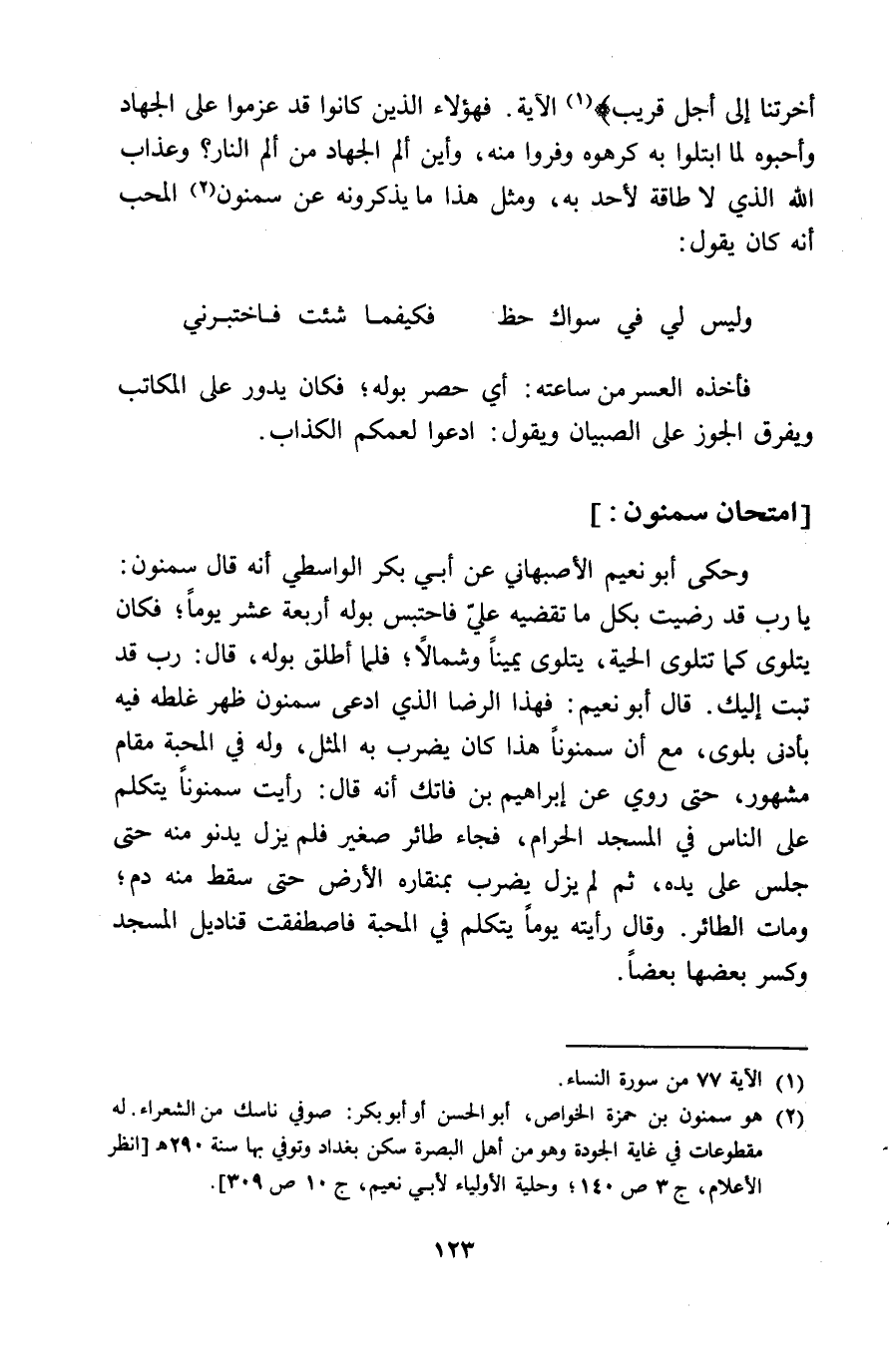أخرتنا الى أجل قريب الْآيَة فَهَؤُلَاءِ الَّذين كَانُوا قد عزموا على الْجِهَاد وأحبوه لما ابتلوا بِهِ كرهوه وفروا مِنْهُ وَأَيْنَ ألم الْجِهَاد من ألم النَّار وَعَذَاب الله الَّذِي لَا طَاقَة لأحد بِهِ وَمثل هَذَا مَا يذكرُونَهُ عَن سمنون الْمُحب أَنه كَانَ يَقُول وَلَيْسَ لي فِي سواك حَظّ فكيفما شِئْت فاختبرني فَأَخذه الْعسر من سَاعَته أَي حسر بَوْله فَكَانَ يَدُور على الْمكَاتب وَيفرق الْمُحب أَنه كَانَ يَقُول وَلَيْسَ لي فِي سواك حظفكيفما شِئْت فاختبرني فأخذة الْعسر من سَاعَته أَي حصر بَوْله فَكَانَ يَدُور على الْمكَاتب وَيفرق الْجَوْز على الصّبيان وَيَقُول ادعوا لعمكم الْكذَّاب امتحان سمنون وَحكى أَبُو نعيم الْأَصْبَهَانِيّ عَن أبي بكر الوَاسِطِيّ أَنه قَالَ سمنون يَا رب قد رضيت بِكُل مَا تقضيه عَليّ فاحتبس بَوْله أَرْبَعَة عشر يَوْمًا فَكَانَ يتلوى كَمَا تتلوى الْحَيَّة يتلوى يَمِينا وَشمَالًا فَلَمَّا أطلق بَوْله قَالَ رب قد تبت اليك قَالَ أَبُو نعيم فَهَذَا الرِّضَا الَّذِي ادّعى سمنون ظهر غلطه فِيهِ بِأَدْنَى بلوى مَعَ أَن سمنونا هَذَا كَانَ يضْرب بِهِ الْمثل وَله فِي الْمحبَّة مقَام مَشْهُور حَتَّى رُوِيَ عَن ابراهيم بن فاتك أَنه قَالَ رَأَيْت سمنونا يتَكَلَّم على النَّاس فِي الْمَسْجِد الْحَرَام فجَاء طَائِر صَغِير فَلم يزل يدنو مِنْهُ حَتَّى جلس على يَده ثمَّ لم يزل يضْرب بمنقاره الأَرْض حَتَّى سقط مِنْهُ دم وَمَات الطَّائِر وَقَالَ رَأَيْته يَوْمًا يتَكَلَّم فِي الْمحبَّة فَاصْطَفَقَتْ قناديل الْمَسْجِد وَكسر بَعْضهَا بَعْضًا