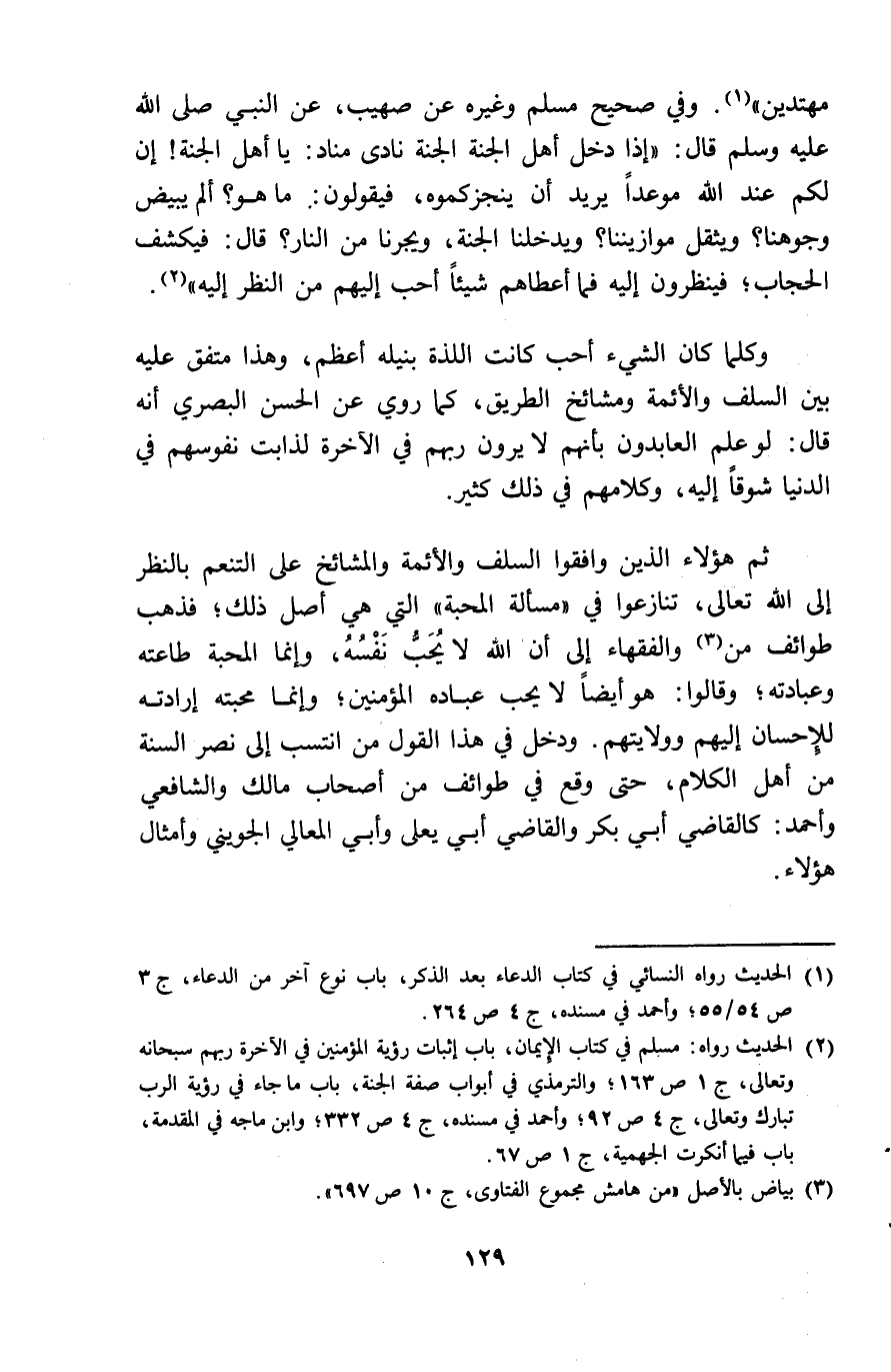 مهتدين وَفِي صَحِيح مُسلم وَغَيره عَن صُهَيْب عَن النَّبِي صلى الله عَلَيْهِ وَسلم قَالَ اذا دخل أهل الْجنَّة الْجنَّة نَادَى مُنَاد يَا أهل الْجنَّة ان لكم عِنْد الله موعدا يُرِيد أَن ينجزكموه فَيَقُولُونَ مَا هُوَ ألم يبيض وُجُوهنَا ويثقل موازيننا ويدخلنا الْجنَّة ويجرنا من النَّار قَالَ فَيكْشف الْحجاب فَيَنْظُرُونَ اليه فَمَا أَعْطَاهُم شَيْئا أحب اليهم من النّظر اليه وَكلما كَانَ الشَّيْء أحب كَانَت اللَّذَّة بنيله أعظم وَهَذَا مُتَّفق عَلَيْهِ بَين السّلف وَالْأَئِمَّة ومشائخ الطَّرِيق كَمَا رُوِيَ عَن الْحسن الْبَصْرِيّ أَنه قَالَ لَو علم العابدون بِأَنَّهُم لَا يرَوْنَ رَبهم فِي الْآخِرَة لذابت نُفُوسهم فِي الدُّنْيَا شوقا اليه وَكَلَامهم فِي ذَلِك كثير ثمَّ هَؤُلَاءِ الَّذين وافقوا السّلف وَالْأَئِمَّة والمشائخ على التنعم بِالنّظرِ الى الله تَعَالَى تنازعوا فِي مَسْأَلَة الْمحبَّة الَّتِي هِيَ أصل ذَلِك فَذهب طوائف من وَالْفُقَهَاء الى أَن الله لَا يحب نَفسه وانما الْمحبَّة طَاعَته وعبادته وَقَالُوا هُوَ أَيْضا لَا يحب عباده الْمُؤمنِينَ وانما محبته ارادته للاحسان اليهم وولايتهم وَدخل فِي هَذَا القَوْل من انتسب الى نصر السّنة من أهل الْكَلَام حَتَّى وَقع فِي طوائف من أَصْحَاب مَالك وَالشَّافِعِيّ وَأحمد كَالْقَاضِي أبي بكر وَالْقَاضِي أبي يعلى وَأبي الْمَعَالِي الْجُوَيْنِيّ وأمثال هَؤُلَاءِ