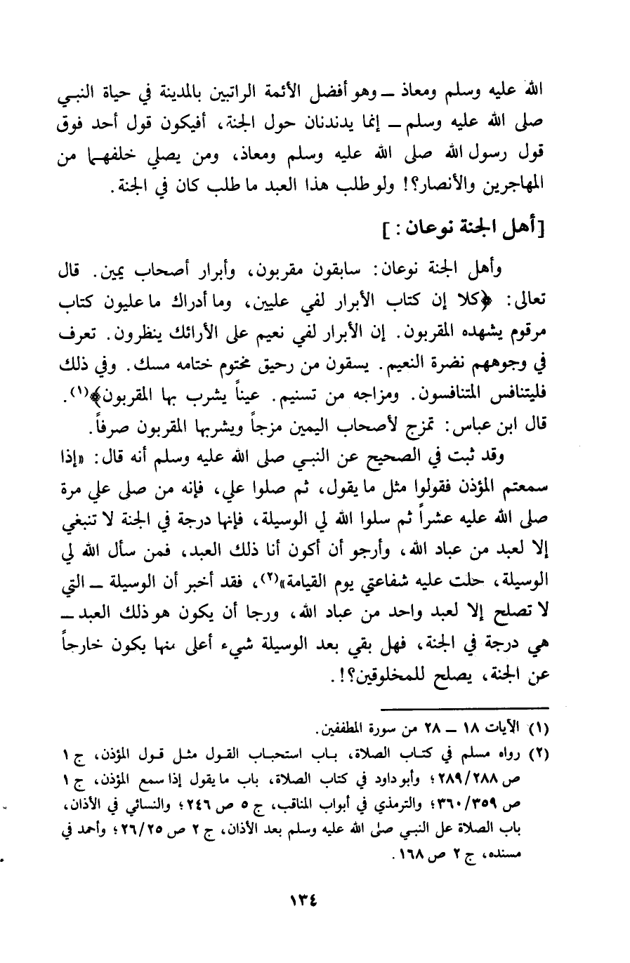 الله عَلَيْهِ وَسلم ومعاذ وَهُوَ أفضل الْأَئِمَّة الراتبين بِالْمَدِينَةِ فِي حَيَاة النَّبِي صلى الله عَلَيْهِ وَسلم انما يدندنان حول الْجنَّة أفيكون قَول أحد فَوق قَول رَسُول الله صلى الله عَلَيْهِ وَسلم ومعاذ وَمن يُصَلِّي خلفهمَا من الْمُهَاجِرين وَالْأَنْصَار وَلَو طلب هَذَا العَبْد مَا طلب كَانَ فِي الْجنَّة أهل الْجنَّة نَوْعَانِ وَأهل الْجنَّة نَوْعَانِ سَابِقُونَ مقربون وأبرار أَصْحَاب يَمِين قَالَ تَعَالَى كلا ان كتاب الْأَبْرَار لفي عليين وَمَا أَدْرَاك مَا عليون كتاب مرقوم يشهده المقربون ان الْأَبْرَار لفي نعيم على الأرائك ينظرُونَ تعرف فِي وُجُوههم نَضرة النَّعيم يسقون من رحيق مختوم ختامه مسك وَفِي ذَلِك فَلْيَتَنَافَس الْمُتَنَافسُونَ ومزاجه من تسنيم عينا يشرب بهَا المقربون قَالَ ابْن عَبَّاس تمزج لأَصْحَاب الْيَمين مزجا ويشربها المقربون صرفا وَقد ثَبت فِي الصَّحِيح عَن النَّبِي صلى الله عَلَيْهِ وَسلم أَنه قَالَ اذا سَمِعْتُمْ الْمُؤَذّن فَقولُوا مثل مَا يَقُول ثمَّ صلوا عَليّ فَإِنَّهُ من صلى عَليّ مرّة صلى الله عَلَيْهِ عشرا ثمَّ سلوا الله لي الْوَسِيلَة فَإِنَّهَا دَرَجَة فِي الْجنَّة لَا تنبغي الا لعبد من عباد الله وَأَرْجُو أَن أكون أَنا ذَلِك العَبْد فَمن سَأَلَ الله لي الوسلية حلت عَلَيْهِ شَفَاعَتِي يَوْم الْقِيَامَة فقد أخبر أَن الْوَسِيلَة الَّتِي لَا تصلح الا لعبد وَاحِد من عباد الله وَرَجا أَن يكون هُوَ ذ لَك العَبْد هِيَ دَرَجَة فِي الْجنَّة فَهَل بَقِي بعد الْوَسِيلَة شَيْء أَعلَى مِنْهَا يكون خَارِجا عَن الْجنَّة يصلح للمخلوقين