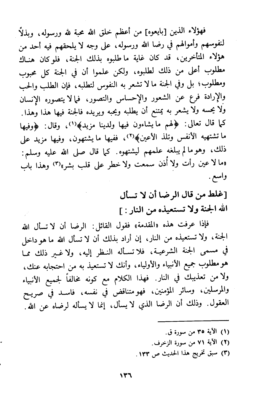 فَهَؤُلَاءِ الَّذين بَايعُوهُ من أعظم خلق الله محبَّة لله وَرَسُوله وبذلا لنفوسهم وَأَمْوَالهمْ فِي رضَا الله وَرَسُوله على وَجه لَا يلحقهم فِيهِ أحد من هَؤُلَاءِ الْمُتَأَخِّرين قد كَانَ غَايَة مَا طلبوه بذلك الْجنَّة فَلَو كَانَ هُنَاكَ مَطْلُوب أَعلَى من ذَلِك لطلبوه وَلَكِن علمُوا أَن فِي الْجنَّة كل مَحْبُوب ومطلوب بل وَفِي الْجنَّة مَا لَا تشعر بِهِ النُّفُوس لتطلبه فَإِن الطّلب وَالْحب والارادة فرع عَن الشُّعُور والاحساس والتصور فَمَا لَا يتصوره الانسان وَلَا يسحه وَلَا يشْعر بِهِ يمْتَنع أَن يَطْلُبهُ وَيُحِبهُ ويريده فالجنة فِيهَا هَذَا وَهَذَا كَمَا قَالَ تَعَالَى لَهُم مَا يشاءون فِيهَا ولدينا مزِيد وَقَالَ وفيهَا مَا تشتهيه الْأَنْفس وتلذ الْأَعْين فَفِيهَا مَا يشتهون وفيهَا مزِيد على ذَلِك وَهُوَ مَا لم يبلغهُ علمهمْ ليشتهوه كَمَا قَالَ صلى الله عَلَيْهِ وَسلم مَا لَا عين رَأَتْ وَلَا أذن سَمِعت وَلَا خطر على قلب بشر وَهَذَا بَاب وَاسع غلط من قَالَ الرِّضَا أَن لَا تسْأَل الله الْجنَّة وَلَا تستعيذه من النَّار فاذا عرفت هَذِه الْمُقدمَة فَقَوْل الْقَائِل الرِّضَا أَن لَا تسْأَل الله الْجنَّة وَلَا تستعيذه من النَّار ان أَرَادَ بذلك أَن لَا تسْأَل الله مَا هُوَ دَاخل فِي مُسَمّى الْجنَّة الشَّرْعِيَّة فَلَا تسأله النطر اليه وَلَا غير ذَلِك مِمَّا هُوَ مَطْلُوب جَمِيع الْأَنْبِيَاء والأولياء وَأَنَّك لَا تستعيذ بِهِ من احتجابه عَنْك وَلَا من تعذيبك فِي النَّار فَهَذَا الْكَلَام مَعَ كَونه مُخَالفا لجَمِيع الْأَنْبِيَاء وَالْمُرْسلِينَ وَسَائِر الْمُؤمنِينَ فَهُوَ متناقض فِي نَفسه فَاسد فِي صَرِيح الْعُقُول وَذَلِكَ أَن الرِّضَا الَّذِي لَا يسْأَل انما لَا يسْأَله لرضاه عَن الله