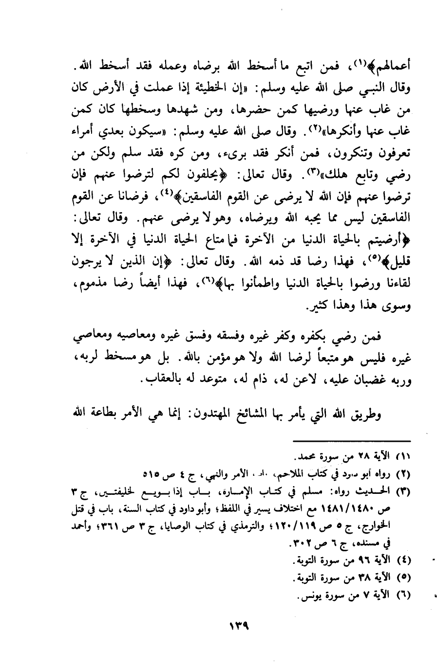 أَعْمَالهم فَمن اتبع مَا أَسخط الله بِرِضَاهُ وَعَمله فَقَط أَسخط الله وَقَالَ النَّبِي صلى الله عَلَيْهِ وَسلم ان الْخَطِيئَة اذا عملت فِي الأَرْض كَانَ من غَابَ عَنْهَا ورضيها كمن حضرها وَمن شَهِدَهَا وسخطها كَانَ كمن غَابَ عَنْهَا وأنكرها وَقَالَ صلى الله عَلَيْهِ وَسلم سَيكون بعدِي أُمَرَاء تعرفُون وتنكرون فَمن أنكر فقد برىء وَمن كره فقد سلم وَلَكِن من رَضِي وتابع هلك وَقَالَ تَعَالَى يحلفُونَ لكم لترضوا عَنْهُم فن ترضوا عَنْهُم فان الله لَا يرضى عَن الْقَوْم الْفَاسِقين فَرضنَا عَن الْقَوْم الْفَاسِقين لَيْسَ مِمَّا يُحِبهُ الله ويرضاه وَهُوَ لَا يرضى عَنْهُم وَقَالَ تَعَالَى أرضيتم بِالْحَيَاةِ الدُّنْيَا من الْآخِرَة فَمَا مَتَاع الْحَيَاة الدِّينَا فِي الْآخِرَة الا قَلِيل فَهَذَا رضَا قد ذمَّة الله وَقَالَ تعال ان الَّذين لَا يرجون لقاءنا وَرَضوا بِالْحَيَاةِ الدُّنْيَا واطمأنوا بهَا فَهَذَا أَيْضا رضَا مَذْمُوم وَسوى هَذَا وَهَذَا كثير فَمن رَضِي بِكُفْرِهِ وَكفر غَيره وفسقه وَفسق غَيره ومعاصيه ومعاصي غَيره فَلَيْسَ هُوَ مُتبعا لرضا الله وَلَا هُوَ مُؤمن بِاللَّه بل هُوَ مسخط لرَبه وربه غَضْبَان عَلَيْهِ لَا عَن لَهُ ذام لَهُ متوعد لَهُ بالعقاب وَطَرِيق الله الَّتِي يَأْمر بهَا المشائخ المهتدون انما هِيَ الْأَمر بِطَاعَة الله