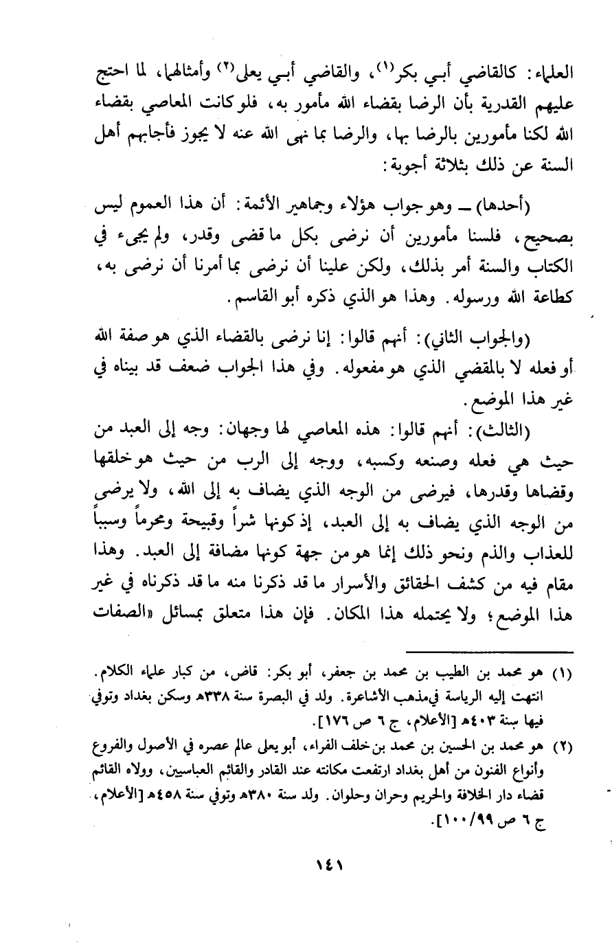 الْعلمَاء كَالْقَاضِي أبي بكر وَالْقَاضِي أبي يعلى وأمثالهما لما احْتج عَلَيْهِم الْقَدَرِيَّة بِأَن الرِّضَا بِقَضَاء الله مَأْمُور بِهِ فَلَو كَانَت الْمعاصِي بِقَضَاء الله لَكنا مأمورين بِالرِّضَا بهَا وَالرِّضَا بِمَا نهى الله عَنهُ لَا يجوز فأجابهم أهل السّنة عَن ذَلِك بِثَلَاثَة أجوبة أَحدهَا وَهُوَ جَوَاب هَؤُلَاءِ وجماهير الْأَئِمَّة أَن هَذَا الْعُمُوم لَيْسَ بِصَحِيح فلسنا مأمورين أَن نرضى بِكُل مَا قضى وَقدر وَلم يجىء فِي الْكتاب وَالسّنة أَمر بذلك وَلَكِن علينا أَن نرضى بِمَا أمرنَا أَن نرضى بِهِ كطاعة الله وَرَسُوله وَهَذَا هُوَ الَّذِي ذكره أَبُو الْقَاسِم وَالْجَوَاب الثَّانِي أَنهم قَالُوا انا نرضى بِالْقضَاءِ الَّذِي هُوَ صفة الله أَو فعله لَا بالمقضي الَّذِي هُوَ مَفْعُوله وَفِي هَذَا الْجَواب ضعف قد بَيناهُ فِي غير هَذَا الْموضع الثَّالِث أَنهم قَالُوا هَذِه الْمعاصِي لَهَا وَجْهَان وَجه الى العَبْد من حَيْثُ هِيَ فعله وصنعه وَكَسبه وَوجه الى الرب من حَيْثُ هُوَ خلقهَا وقضاها وقدرها فيرضى من الْوَجْه الَّذِي يُضَاف بِهِ الى الله وَلَا يرضى من الْوَجْه الَّذِي يُضَاف بِهِ الى العَبْد اذ كَونهَا شرا وقبيحة ومحرما وسببا للعذاب والذم وَنَحْو ذَلِك انما هُوَ من جِهَة كَونهَا مُضَافَة الى العَبْد وَهَذَا مقَام فِيهِ من كشف الْحَقَائِق والأسرار مَا قد ذكرنَا مِنْهُ مَا قد ذَكرْنَاهُ فِي غير هَذَا الْموضع وَلَا يحْتَملهُ هَذَا الْمَكَان فَإِن هَذَا مُتَعَلق بمسائل الصِّفَات