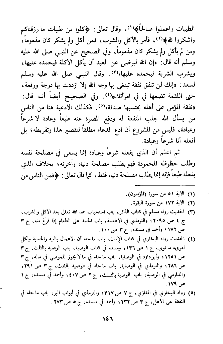 الطَّيِّبَات وَاعْمَلُوا صَالحا وَقَالَ تَعَالَى كلوا من طَيّبَات مَا رزقناكم واشكروا لله فَأمر بِالْأَكْلِ وَالشرب فَمن أكل وَلم يشْكر كَانَ مذموما وَمن لم يَأْكُل وَلم يشْكر كَانَ مذموما وَفِي الصَّحِيح عَن النَّبِي صلى الله عَلَيْهِ وَسلم أَنه قَالَ ان الله ليرضى عَن العَبْد أَن يَأْكُل الْأكلَة فيحمده عَلَيْهَا وَيشْرب الشربة فيحمده عَلَيْهَا وَقَالَ النَّبِي صلى الله عَلَيْهِ وَسلم لسعد انك لن تنْفق نَفَقَة تبتغي بهَا وَجه الله الا ازددت بهَا دَرَجَة ورفعة حَتَّى اللُّقْمَة تضعها فِي فِي امْرَأَتك وَفِي الصَّحِيح أَيْضا أَنه قَالَ نَفَقَة الْمُؤمن على أَهله يحتسبها صَدَقَة فَكَذَلِك الْأَدْعِيَة هُنَا من النَّاس من يسْأَل الله جلب الْمَنْفَعَة لَهُ وَدفع الْمضرَّة عَنهُ طبعا وَعَادَة لَا شرعا وَعبادَة فَلَيْسَ من الْمَشْرُوع أَن ادْع الدُّعَاء مُطلقًا لتقصير هَذَا وتفريطه بل أَفعلهُ أَنا شرعا وَعبادَة ثمَّ اعْلَم أَن الَّذِي يَفْعَله شرعا وَعبادَة انما يسْعَى فِي مصلحَة نَفسه وَطلب حظوظه المحمودة فَهُوَ يطْلب مصلحَة دُنْيَاهُ وآخرته بِخِلَاف الَّذِي يَفْعَله طبعا فَإِنَّهُ انما يطْلب مصلحَة دُنْيَاهُ فَقَط كَمَا قَالَ تعال فَمن النَّاس من