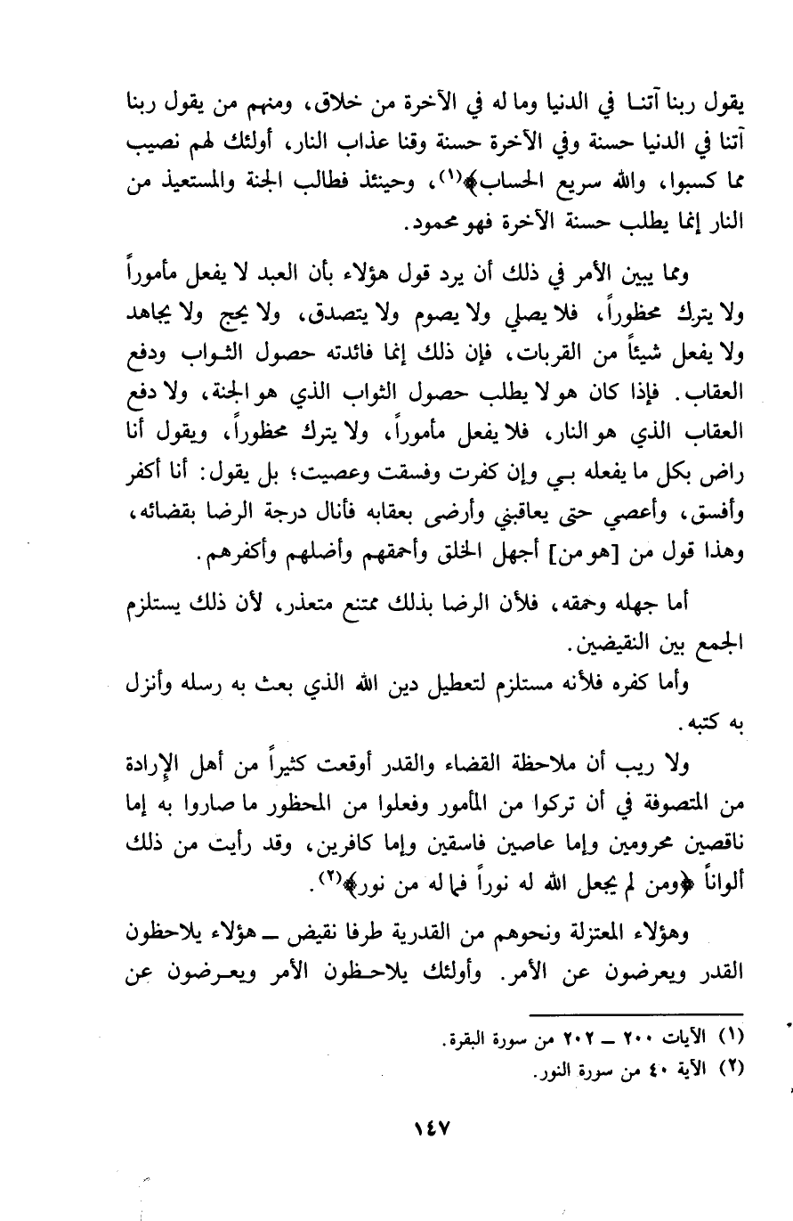 يَقُول رَبنَا آتنا فِي الدُّنْيَا وَمَا لَهُ فِي الْآخِرَة من خلاق وَمِنْهُم من يَقُول رَبنَا آتنا فِي الدُّنْيَا حَسَنَة وَفِي الْآخِرَة حَسَنَة وقنا عَذَاب النَّار أُولَئِكَ لَهُم نصيب مِمَّا كسبوا وَالله سريع الْحساب وَحِينَئِذٍ فطالب الْجنَّة والمستعيذ من النَّار انما يطْلب حَسَنَة الْآخِرَة فَهُوَ مَحْمُود وَمِمَّا يبين الْأَمر فِي ذَلِك أَن يرد قَول هَؤُلَاءِ بِأَن العَبْد لَا يفعل مَأْمُورا وَلَا يتْرك مَحْظُورًا فَلَا يُصَلِّي وَلَا يَصُوم وَلَا يتَصَدَّق وَلَا يحجّ وَلَا يُجَاهد وَلَا يفعل شَيْئا من القربات فَإِن ذَلِك انما فَائِدَته حُصُول الثَّوَاب وَدفع الْعقَاب الَّذِي هُوَ النَّار فَلَا يفعل مَأْمُورا وَلَا يتْرك مَحْظُورًا وَيَقُول أَنا رَاض بِكُل مَا يَفْعَله بِي وان كفرت وفسقت وعصيت بل يَقُول أَنا أكفر وأفسق وأعصي حَتَّى يعاقبني وأرضى بعقابه فأنال دَرَجَة الرِّضَا بِقَضَائِهِ وَهَذَا قَول من هُوَ من أَجْهَل الْخلق وأحمقهم وأضلهم وأكفرهم أما جهلة وحمقه فَلِأَن الرِّضَا بذلك مُمْتَنع مُتَعَذر لِأَن ذَلِك يسْتَلْزم الْجمع بَين النقيضين وَأما كفره فَلِأَنَّهُ مُسْتَلْزم لتعطيل دين الله الَّذِي بعث بِهِ رسله وَأنزل بِهِ كتبه وَلَا ريب أَن مُلَاحظَة الْقَضَاء وَالْقدر أوقعت كثيرا من أهل الارادة من المتصوفة فِي أَن تركُوا من الْمَأْمُور وفعلوا من الْمَحْظُور مَا صَارُوا بِهِ اما ناقصين محرومين واما عاصين فاسقين واما كَافِرين وَقد رَأَيْت من ذَلِك ألوانا وَمن لم يَجْعَل الله لَهُ نورا فَمَا لَهُ من نور وَهَؤُلَاء الْمُعْتَزلَة وَنَحْوهم من الْقَدَرِيَّة طرفا نقيض هَؤُلَاءِ يلاحظون الْقدر ويعرضون عَن الْأَمر وَأُولَئِكَ يلاحظون الْأَمر ويعرضون عَن