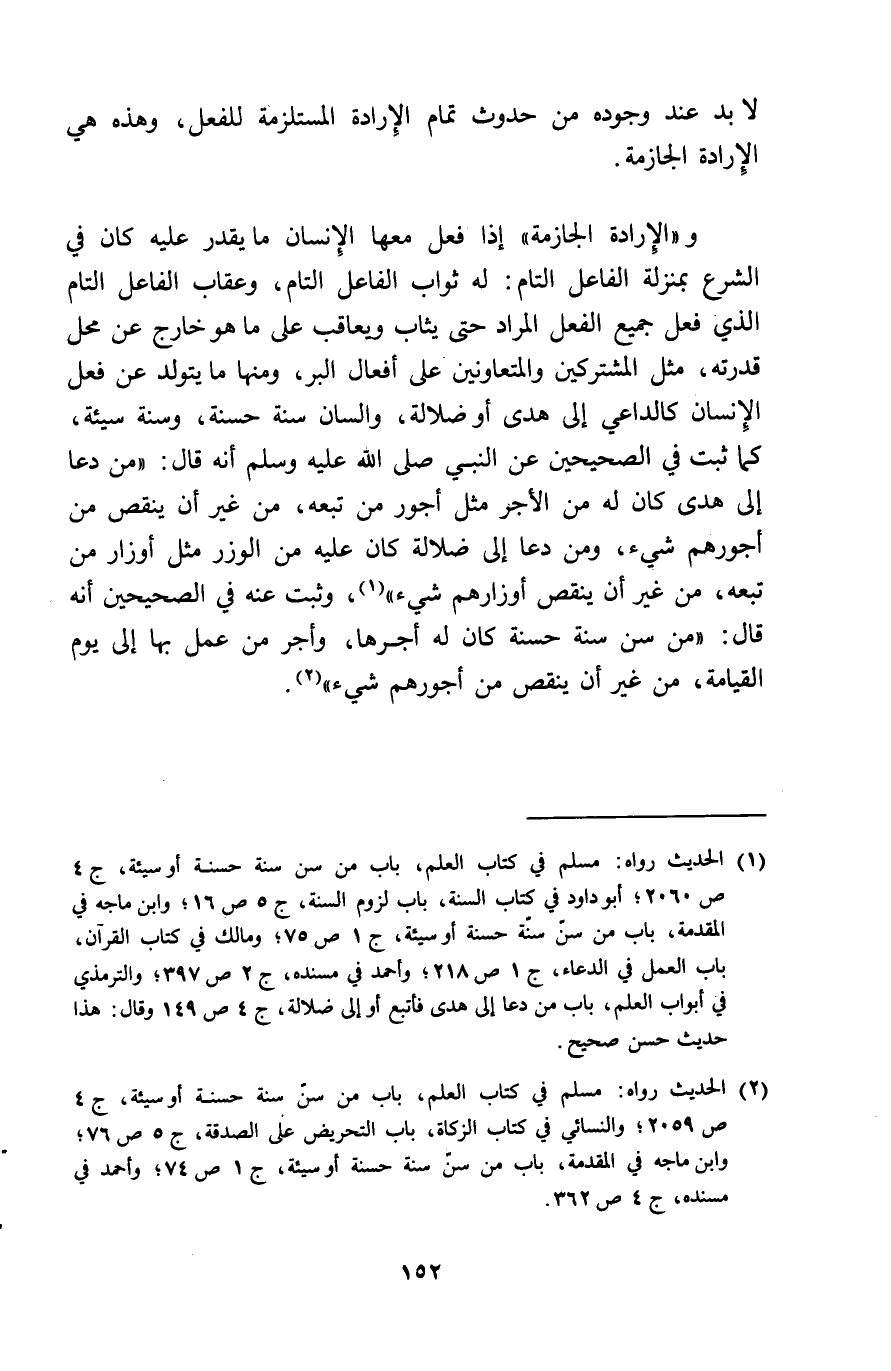 لَا بُد عِنْد وجود من حُدُوث تَمام الارادة المستلزمة للْفِعْل وَهَذِه هِيَ الارادة الجازمة والارادة الجازمة اذا فعل مَعهَا الانسان مَا يقدر عَلَيْهِ كَانَ فِي الشَّرْع بِمَنْزِلَة الْفَاعِل التَّام لَهُ ثَوَاب الْفَاعِل التَّام وعقاب الْفَاعِل التَّام الَّذِي فعل جَمِيع الْفِعْل المُرَاد حَتَّى يُثَاب ويعاقب على مَا هُوَ خَارج عَن مَحل قدرته مثل المشتركين والمتعاونين على أَفعَال الْبر وَمِنْهَا مَا يتَوَلَّد عَن فعل الانسان كالداعي الى هدى أَو ضَلَالَة والسان سنة حَسَنَة وَسنة سَيِّئَة كَمَا ثَبت فِي الصَّحِيحَيْنِ عَن النَّبِي صلى الله عليى وَسلم أَنه قَالَ من دَعَا الى هدى كَانَ لَهُ من الْأجر مثل أجور من تبعه من غير أَن ينقص من أُجُورهم شَيْء وَمن دَعَا الى ضَلَالَة كَانَ عَلَيْهِ من الْوزر مثل أوزار من تبعه من غير أَن ينقص أوزارهم شَيْء وَثَبت عَنهُ فِي الصححين أَنه قَالَ من سنّ سنة حَسَنَة كَانَ لَهُ أجرهَا وَأجر من عمل بهَا الى يَوْم الْقِيَامَة من غير أَن ينقص من أُجُورهم شَيْء