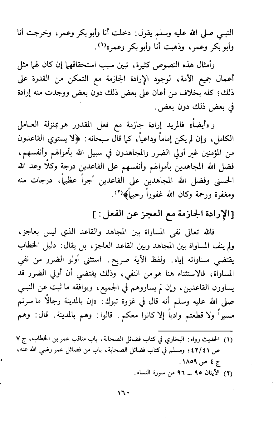 النَّبِي صلى الله عَلَيْهِ وَسلم يَقُول دخلت أَنا وَأَبُو بكر وَعمر وَخرجت أَنا وَأَبُو بكر وَعمر وَذَهَبت أَنا وَأَبُو بكر وَعمر وأمثال هَذِه النُّصُوص كَثِيرَة تبين سَبَب استحقاقهما ان كَانَ لَهما مثل أَعمال جَمِيع الْأمة لوُجُود الارادة الجازمة مَعَ التَّمَكُّن من الْقُدْرَة على ذَلِك كُله بِخِلَاف من أعَان على بعض ذَلِك دون بعض وَوجدت مِنْهُ ارادة فِي بعض ذَلِك دون بعض وَأَيْضًا فالمريد ارادة جازمة مَعَ فعل الْمَقْدُور هُوَ بِمَنْزِلَة الْعَامِل الْكَامِل وان لم يكن اماما وداعيا كَمَا قَالَ سُبْحَانَهُ لَا يَسْتَوِي الْقَاعِدُونَ من الْمُؤمنِينَ غير أولي الضَّرَر وَالْمُجَاهِدُونَ فِي سَبِيل الله بِأَمْوَالِهِمْ وأنفسهم فضل الله الْمُجَاهدين بِأَمْوَالِهِمْ وأنفسهم على القاعدين دَرَجَة وكلا وعد الله الحسني وَفضل الله الْمُجَاهدين على القاعدين أجرا عَظِيما دَرَجَات مِنْهُ ومغفرة وَرَحْمَة وَكَانَ الله غَفُورًا رحِيما الارادة الجازمة مَعَ الْعَجز عَن الْفِعْل فَالله تَعَالَى نفى الْمُسَاوَاة بَين الْمُجَاهِد والقاعد الَّذِي لَيْسَ بعاجز وَلم ينف الْمُسَاوَاة بَين الْمُجَاهِد وَبَين الْقَاعِد الْعَاجِز بل يُقَال دَلِيل الْخطاب يَقْتَضِي مساواته اياه وَلَفظ الْآيَة صَرِيح اسْتثْنى أولو الضَّرَر من نفي الْمُسَاوَاة فالأستثناء هُنَا هُوَ من النَّفْي وَذَلِكَ يَقْتَضِي أَن أولي الضَّرَر قد يساوون القاعدين وان لم يساووهم فِي الْجَمِيع وَيُوَافِقهُ مَا ثَبت عَن النَّبِي صلى الله عَلَيْهِ وَسلم أَنه قَالَ فِي غَزْوَة تَبُوك ان بِالْمَدِينَةِ رجَالًا مَا سِرْتُمْ مسيرًا وَلَا قطعْتُمْ وَاديا الا كَانُوا مَعكُمْ قَالُوا وهم بِالْمَدِينَةِ قَالَ وهم