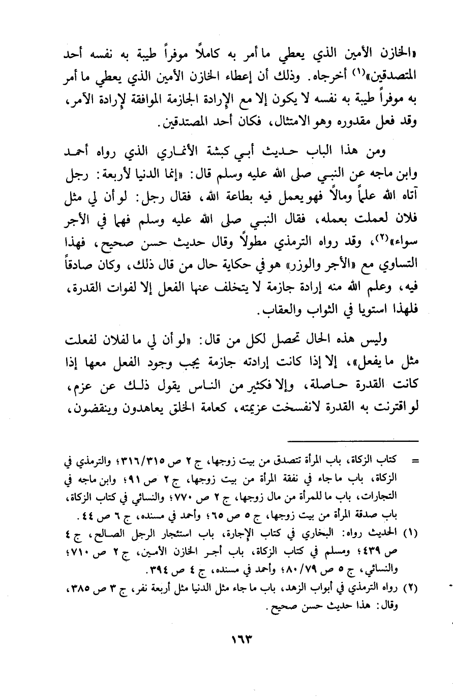الخازن الْأمين الَّذِي يُعْطي مَا أَمر بِهِ كَامِلا موفرا طيبَة بِهِ نَفسه أحد المتصدقين أَخْرجَاهُ وَذَلِكَ أَن اعطاء الخازن الْأمين الَّذِي يُعْطي مَا أَمر بِهِ موفرا طيبَة بِهِ نَفسه لَا يكون الا مَعَ الارادة الجازمة الْمُوَافقَة لارادة الْآمِر وَقد فعل مقدوره وَهُوَ الِامْتِثَال فَكَانَ أحد المصتدقين وَمن هَذَا الْبَاب حَدِيث أبي كَبْشَة الْأَنمَارِي الَّذِي رَوَاهُ أَحْمد وَابْن مَاجَه عَن النَّبِي صلى الله عَلَيْهِ وَسلم قَالَ انما الدُّنْيَا لأربعة رجل آتَاهُ الله علما ومالا فَهُوَ يعْمل فِيهِ بِطَاعَة الله فَقَالَ رجل لَو أَن لي مثل فلَان لعملت بِعَمَلِهِ فَقَالَ النَّبِي صلى الله عَلَيْهِ وَسلم فهما فِي الْأجر سَوَاء وَقد رَوَاهُ التِّرْمِذِيّ مطولا وَقَالَ حَدِيث حسن صَحِيح فَهَذَا التَّسَاوِي مَعَ الْأجر والوزر هُوَ فِي حِكَايَة حَال من قَالَ ذَلِك وَكَانَ صَادِقا فِيهِ وَعلم الله مِنْهُ ارادة جازمة لَا يتَخَلَّف عَنْهَا الْفِعْل الا لفَوَات الْقُدْرَة فَلهَذَا اسْتَويَا فِي الثَّوَاب وَالْعِقَاب وَلَيْسَ هَذِه الْحَال تحصل لكل من قَالَ لَو أَن لي مَا لفُلَان لفَعَلت مثل مَا يفعل الا اذا كَانَت ارادته جازمة يجب وجود الْفِعْل مَعهَا اذا كَانَت الْقُدْرَة حَاصِلَة والا فكثير من النَّاس يَقُول ذَلِك عَن عزم لَو اقترنت بِهِ الْقُدْرَة لَا نفسخت عزيمته كعامة الْخلق يعاهدون وينقضون