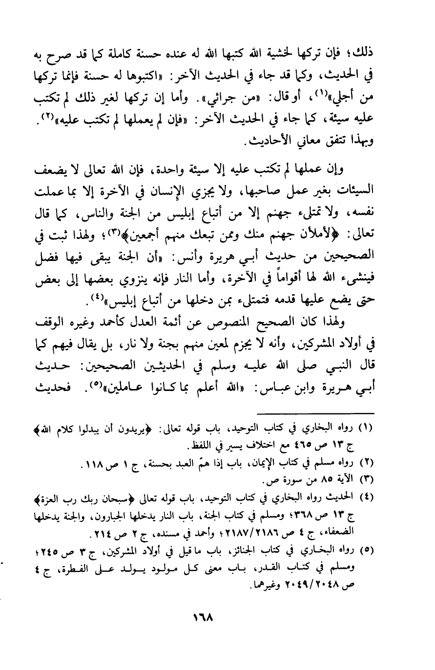 ذَلِك فَإِن تَركهَا لخشية الله كتبهَا الله لَهُ عِنْده حَسَنَة كَامِلَة كَمَا قد صرح بِهِ فِي الحَدِيث وكما قد جَاءَ فِي الحَدِيث الآخر اكتبوها لَهُ حَسَنَة فَإِنَّمَا تَركهَا من أَجلي أَو قَالَ من جرائي وَأما ان تَركهَا لغير ذَلِك لم تكْتب عَلَيْهِ سَيِّئَة كَمَا جَاءَ فِي الحَدِيث الآخر فَإِن لم يعملها لم تكْتب عَلَيْهِ وَبِهَذَا تتفق مَعَاني الْأَحَادِيث وان عَملهَا لم تكْتب عَلَيْهِ الا سَيِّئَة وَاحِدَة فَإِن الله تَعَالَى لَا يضعف السَّيِّئَات بِغَيْر عمل صَاحبهَا وَلَا يَجْزِي الانسان فِي الْآخِرَة الا بِمَا عملت نَفسه وَلَا تمتلىء جَهَنَّم الا من أَتبَاع ابليس من الْجنَّة وَالنَّاس كَمَا قَالَ تَعَالَى لأملأن جَهَنَّم مِنْك وَمِمَّنْ تبعك مِنْهُم أَجْمَعِينَ وَلِهَذَا ثَبت فِي الصَّحِيحَيْنِ من حَدِيث أبي هُرَيْرَة وَأنس أَن الْجنَّة يبْقى فِيهَا فضل فينشىء الله لَهَا أَقْوَامًا فِي الْآخِرَة وَأما النَّار فَإِنَّهُ ينزوي بَعْضهَا الى بعض حَتَّى يضع عَلَيْهَا قدمه فتمتلىء بِمن دَخلهَا من أَتبَاع ابليس وَلِهَذَا كَانَ الصَّحِيح الْمَنْصُوص عَن أَئِمَّة الْعدْل كأحمد وَغَيره الْوَقْف فِي أَوْلَاد الْمُشْركين وَأَنه لَا يجْزم لمُعين مِنْهُم بجنة وَلَا نَار بل يُقَال فيهم كَمَا قَالَ النَّبِي صلى الله عَلَيْهِ وَسلم فِي الْحَدِيثين الصَّحِيحَيْنِ حَدِيث أبي هُرَيْرَة وَابْن عَبَّاس الله أعلم بِمَا كَانُوا عاملين فَحَدِيث